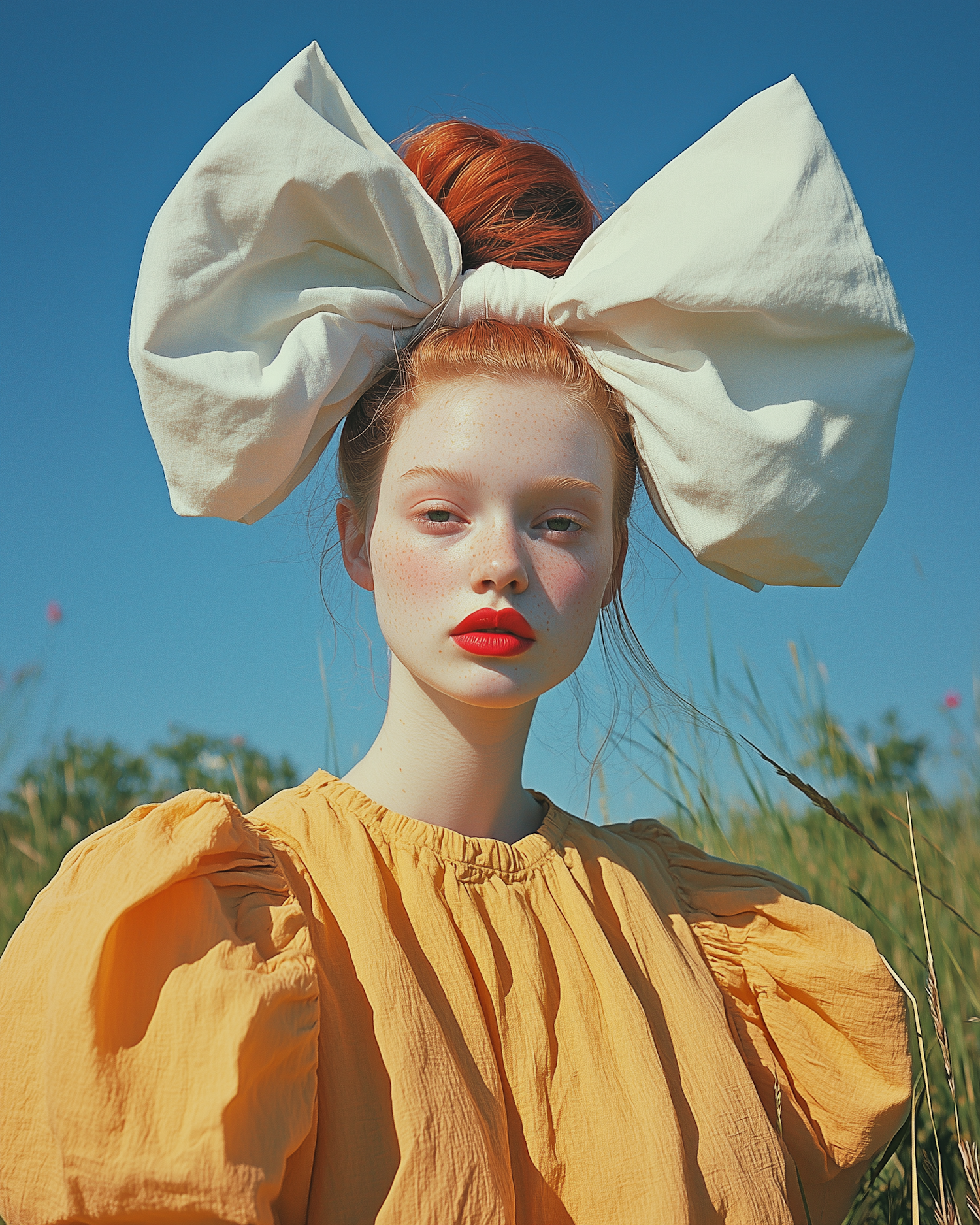 A red-haired woman with a giant white bow, mustard blouse, and bold red lips stands in a grassy field under a clear blue sky.