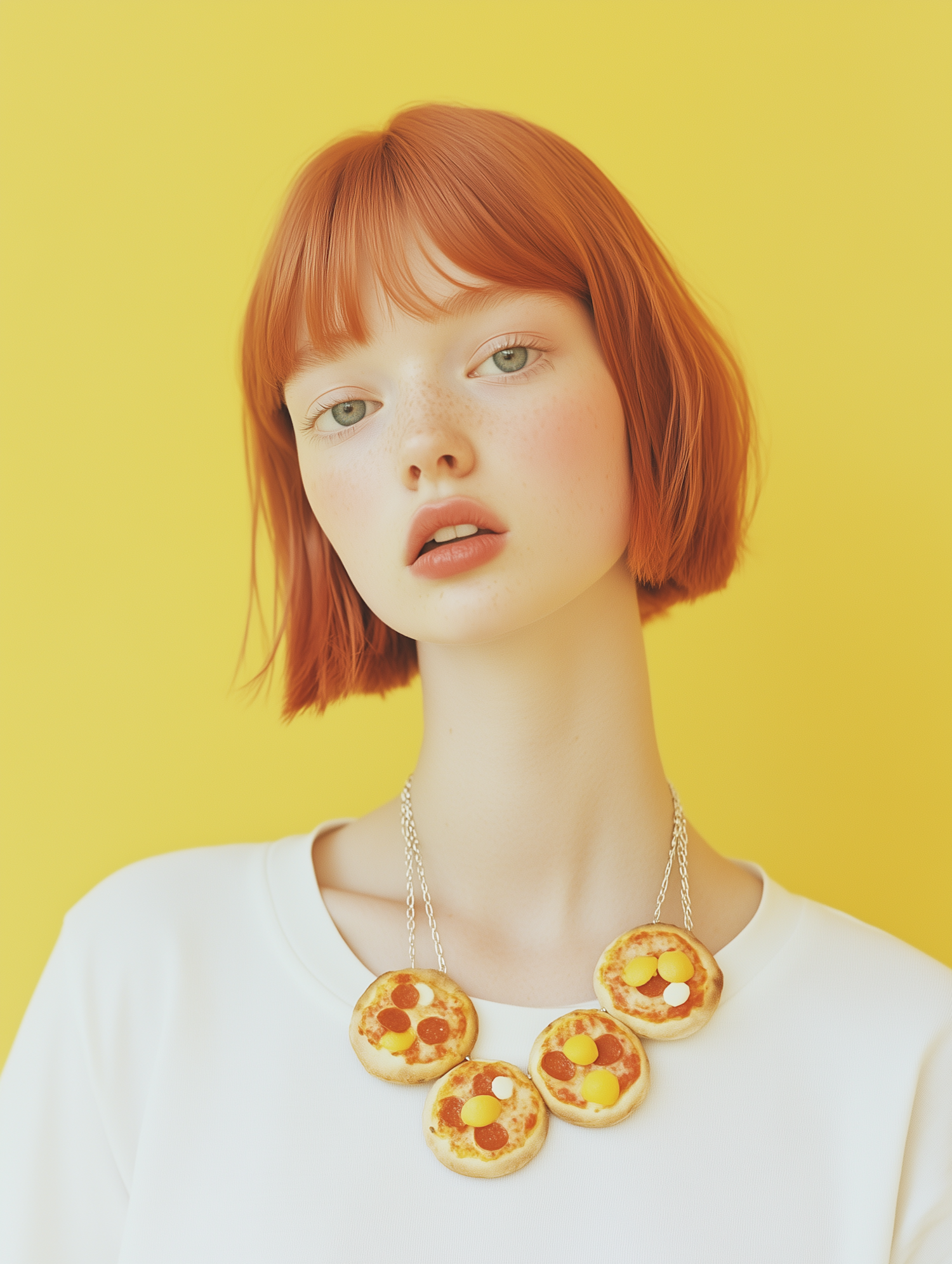 A red-haired woman with a pizza slice necklace against a bright yellow background. Playful and vibrant fashion statement.