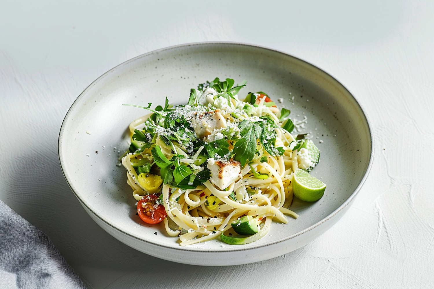 Delicious pasta with arugula, cherry tomatoes, and cheese, garnished with lime wedges in a light bowl. Fresh and vibrant presentation.