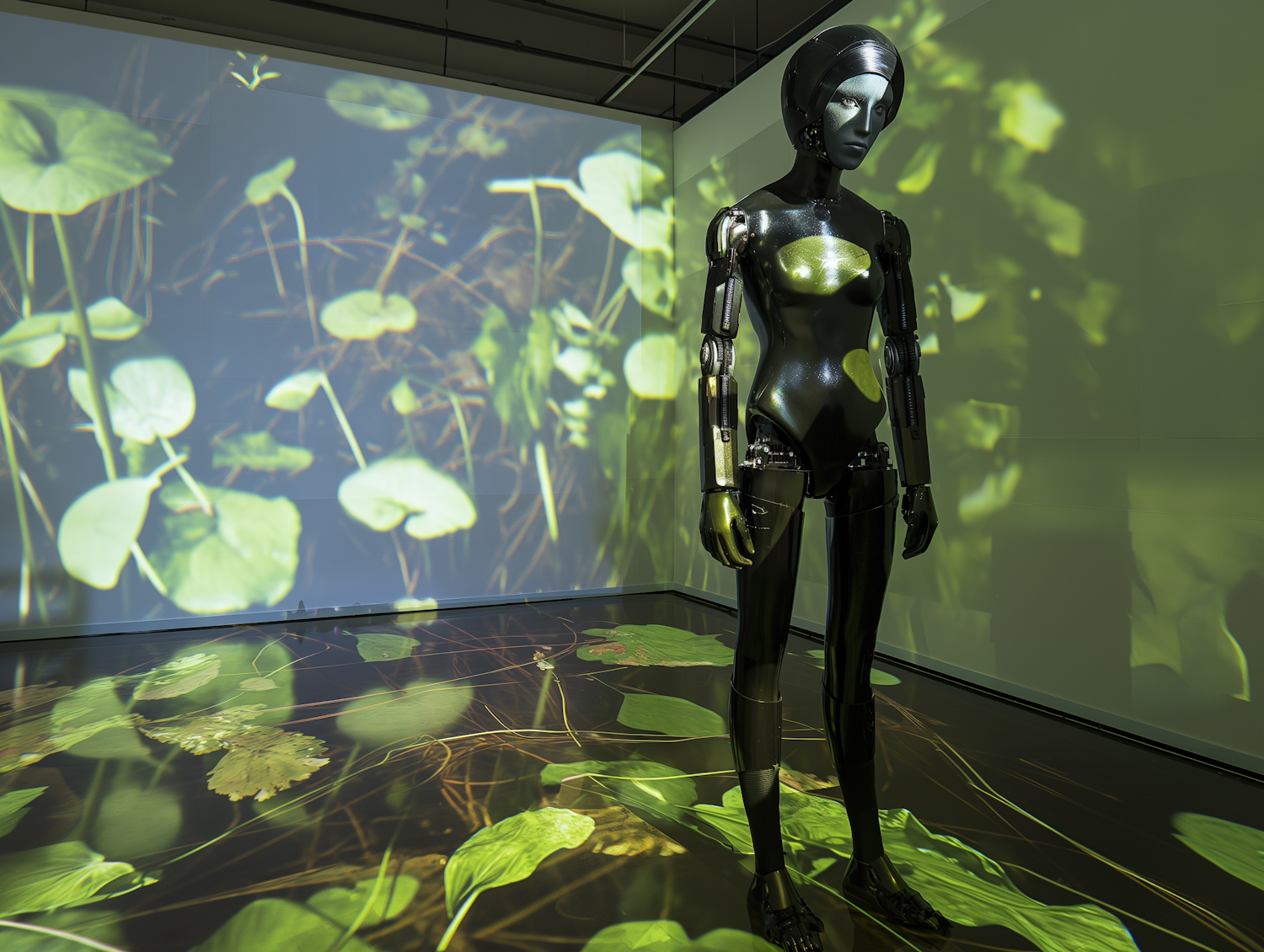A black humanoid robot stands amidst green leaf projections, creating a futuristic blend of technology and nature.