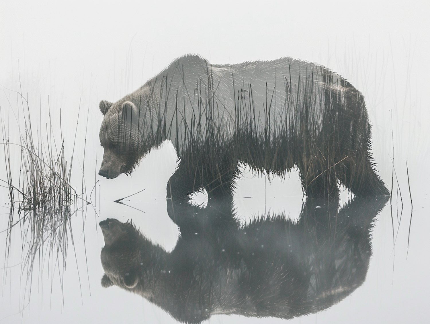 Grizzly bear in misty water with reflection, surrounded by reeds, creating a serene and symmetrical scene.