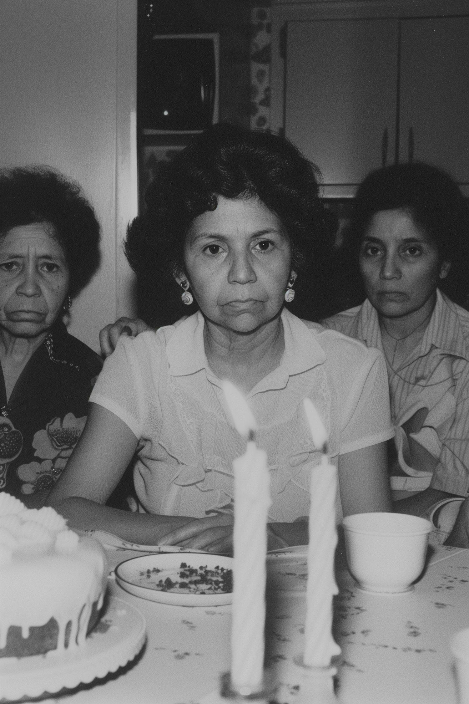Three women with serious expressions sit at a table with lit candles and a cake, suggesting a solemn gathering.
