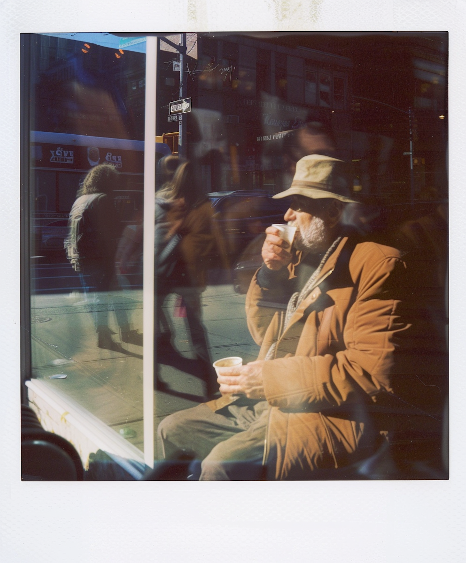Elderly man in a brown coat sips coffee by a window, reflecting a bustling city street scene. Warm sunlight contrasts with urban motion.