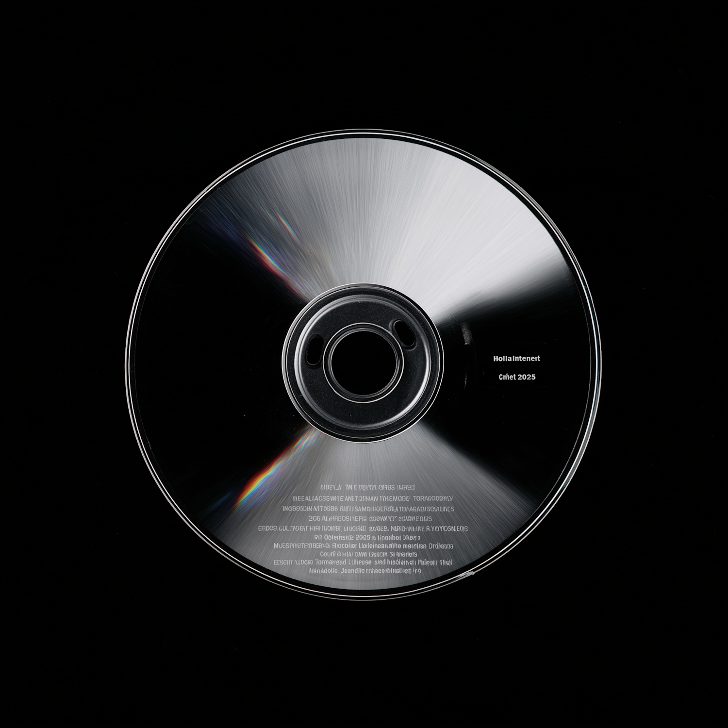 A reflective CD with text details on a black background, showcasing light refraction and a sleek metallic surface.