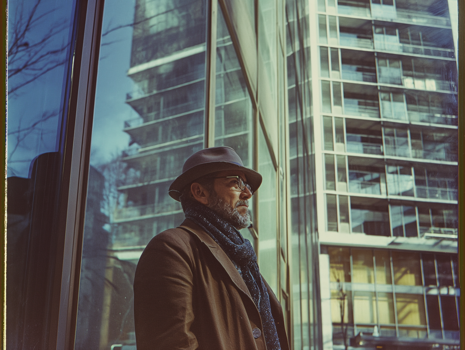 Man in a fedora and overcoat stands by a modern glass building, reflecting urban architecture. Thoughtful expression, blue scarf.
