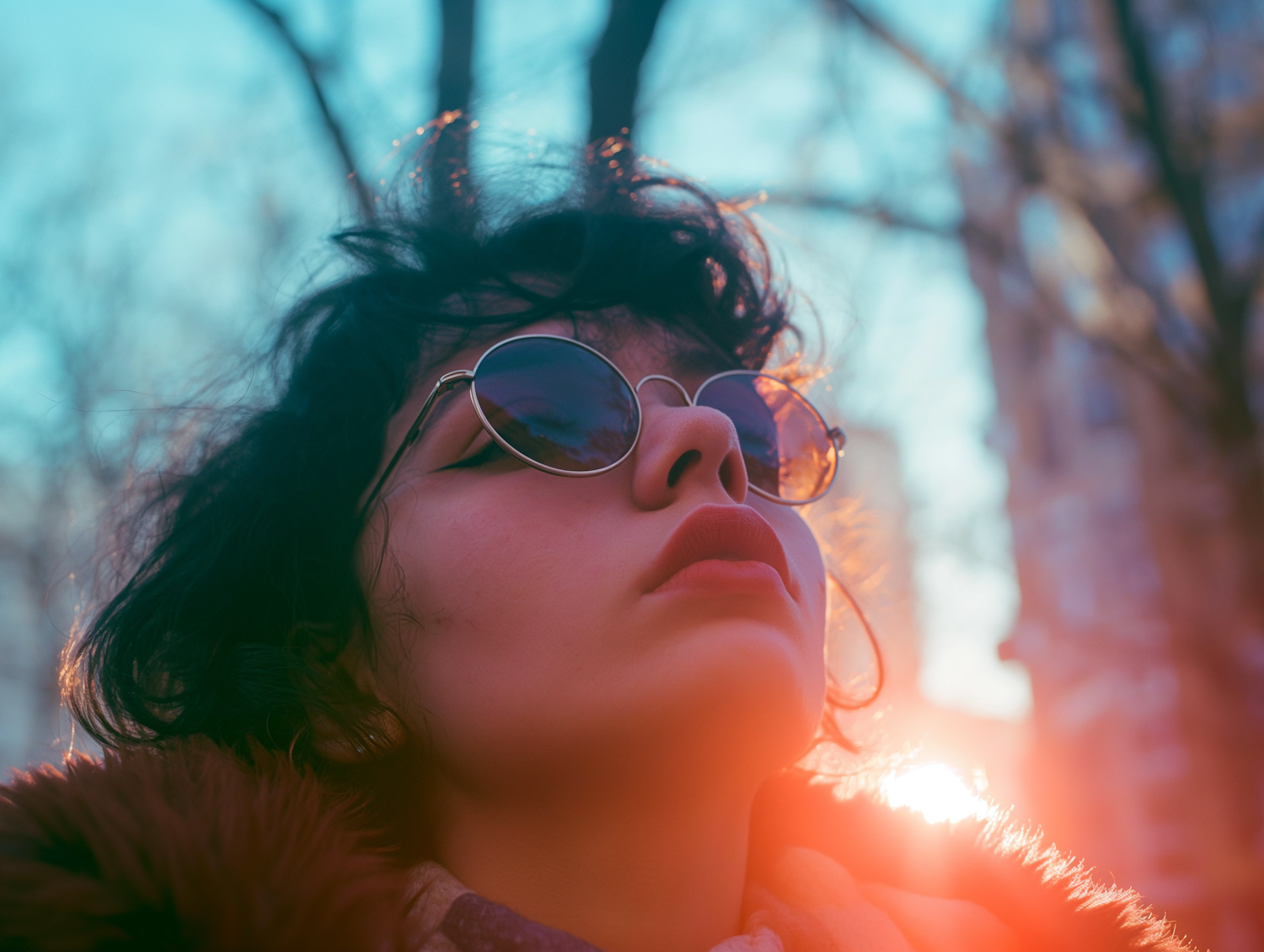 Stylish woman in sunglasses basks in sunset glow, with vibrant colors and urban backdrop creating a serene, contemplative mood.