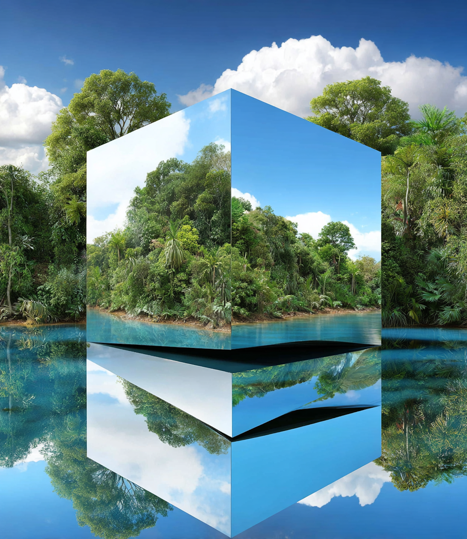 A reflective cube in a tropical setting mirrors lush greenery, blue skies, and water, creating a surreal and artistic visual effect.