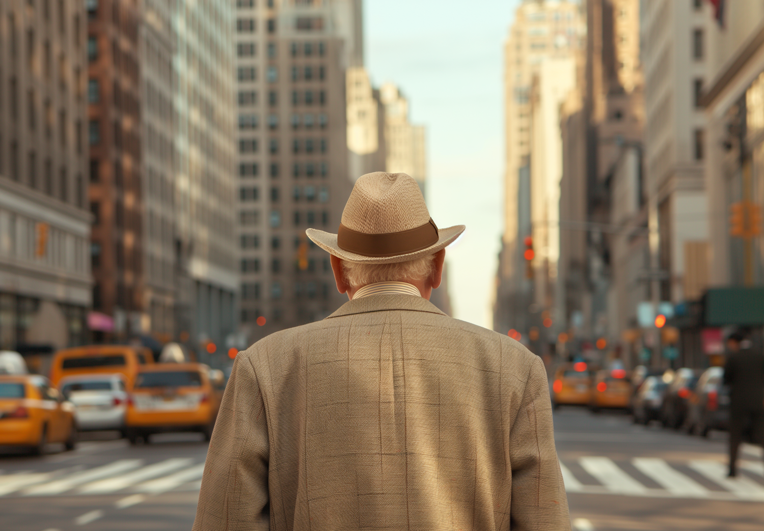 Elderly man in a suit and fedora stands on a busy city street, surrounded by taxis and tall buildings, in warm golden light.