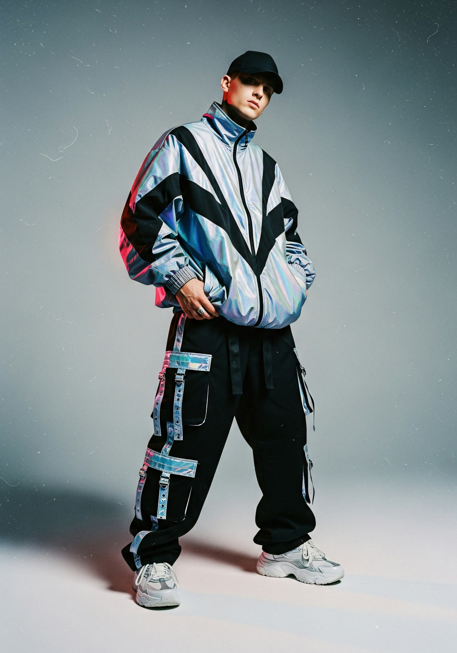 A stylish individual in a reflective jacket and black pants with metallic accents, posing confidently in a studio setting.