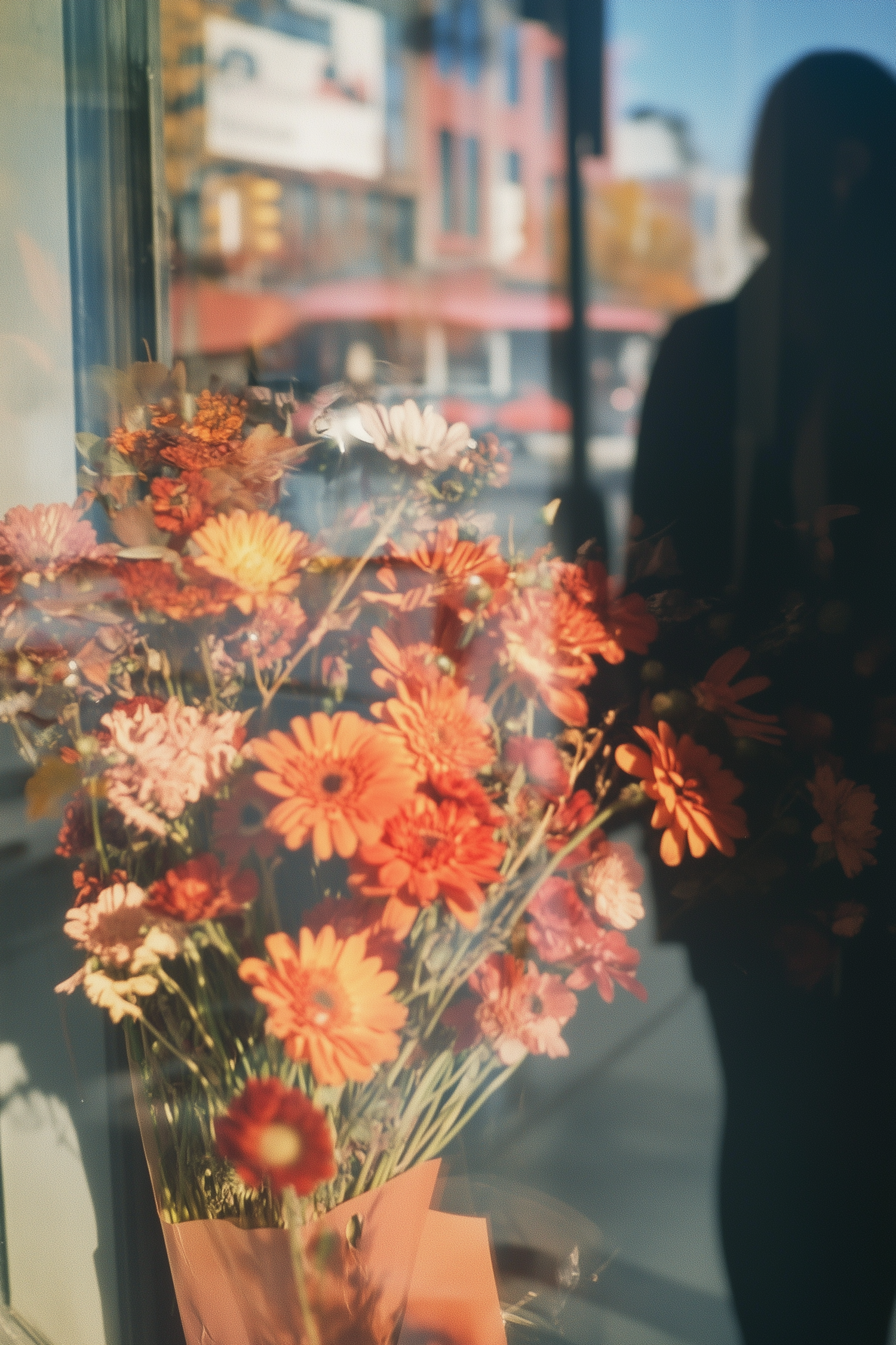 Vibrant bouquet of orange and pink flowers in a window, with reflections and a silhouette creating an artistic urban scene.
