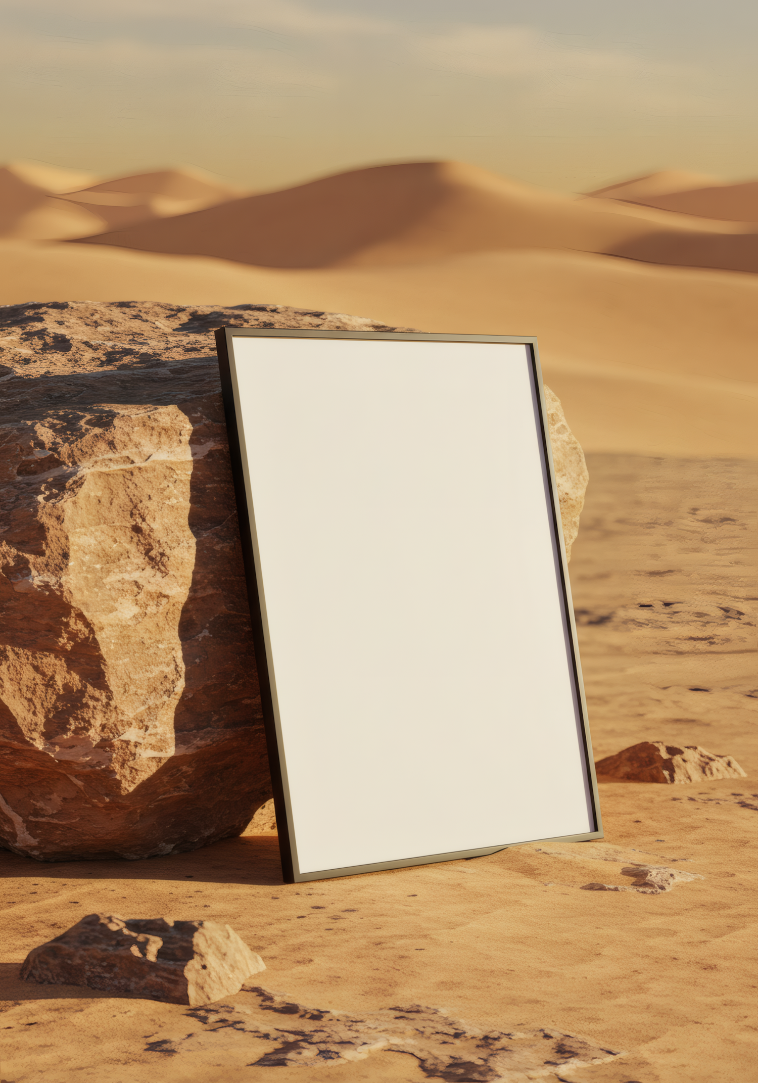 A blank black-framed canvas leans against a rock in a serene desert with golden sand dunes and warm sunlight.