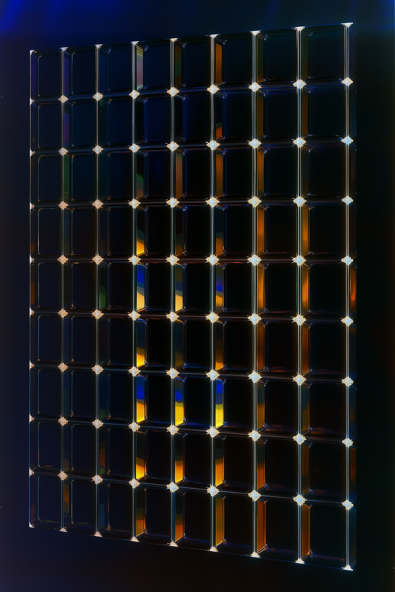 Reflective glass grid with star-like points and refracted hues of blue, yellow, and orange on a dark background.