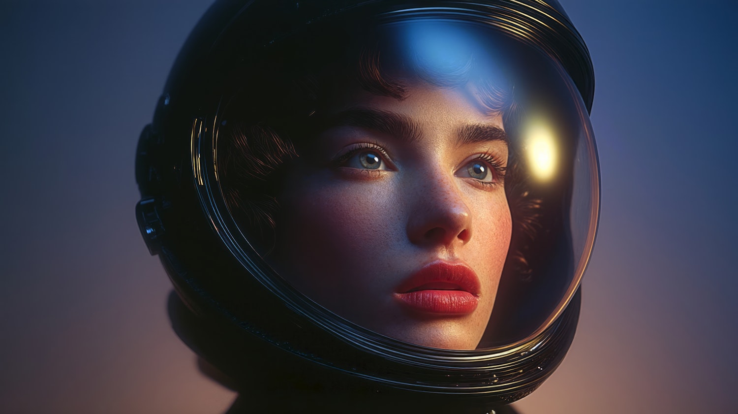 A close-up of a person in a reflective helmet, with soft lighting and a gradient background, evoking a sense of exploration.