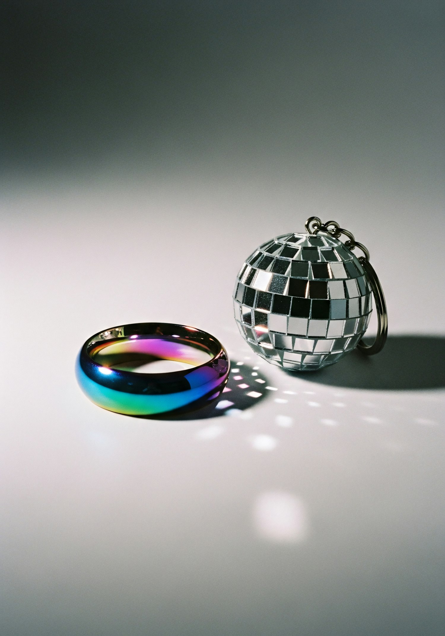 A vibrant metallic ring and a mirrored disco ball keychain create a colorful and reflective composition on a gradient background.