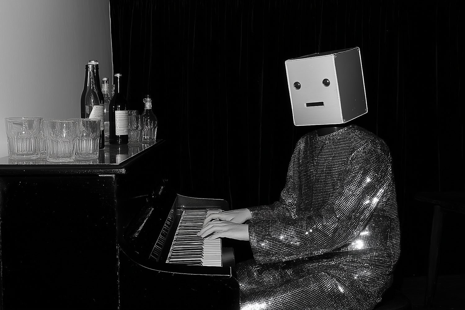 A person in a reflective outfit and box mask plays a piano, with glassware and bottles on top, creating a surreal and artistic scene.