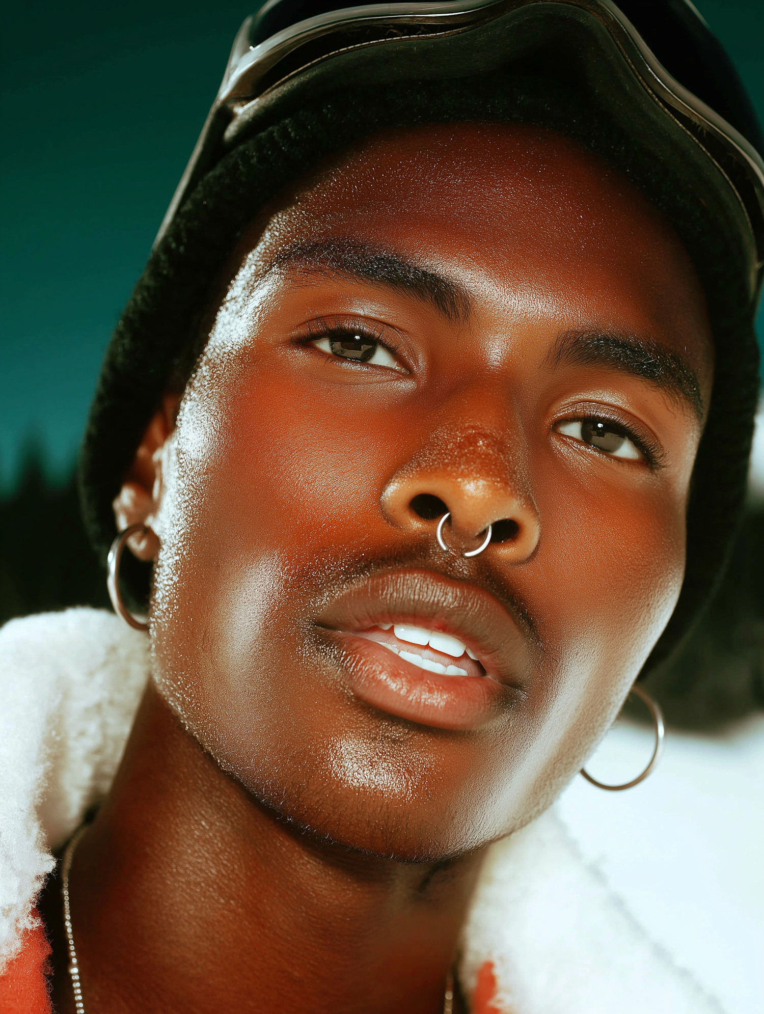 Close-up of an individual with radiant complexion, wearing a black knit cap and septum piercing, set against a softly lit outdoor backdrop.