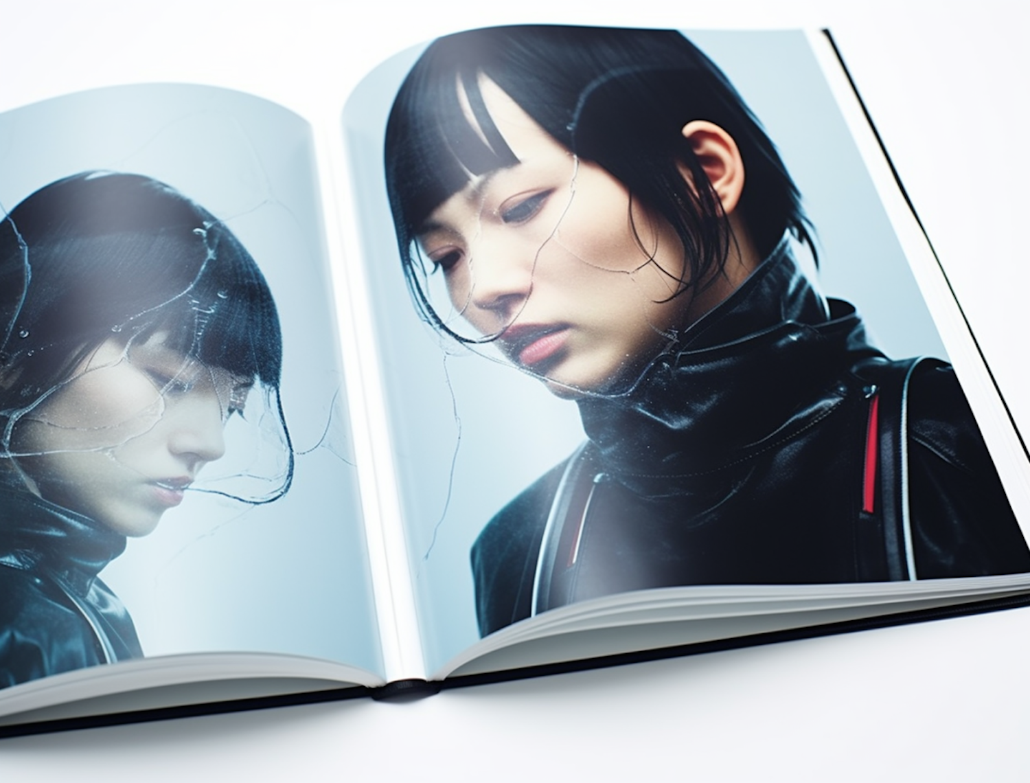 Open book with a futuristic portrait of an Asian woman in black leather, featuring a cracked glass overlay and mirrored reflection.