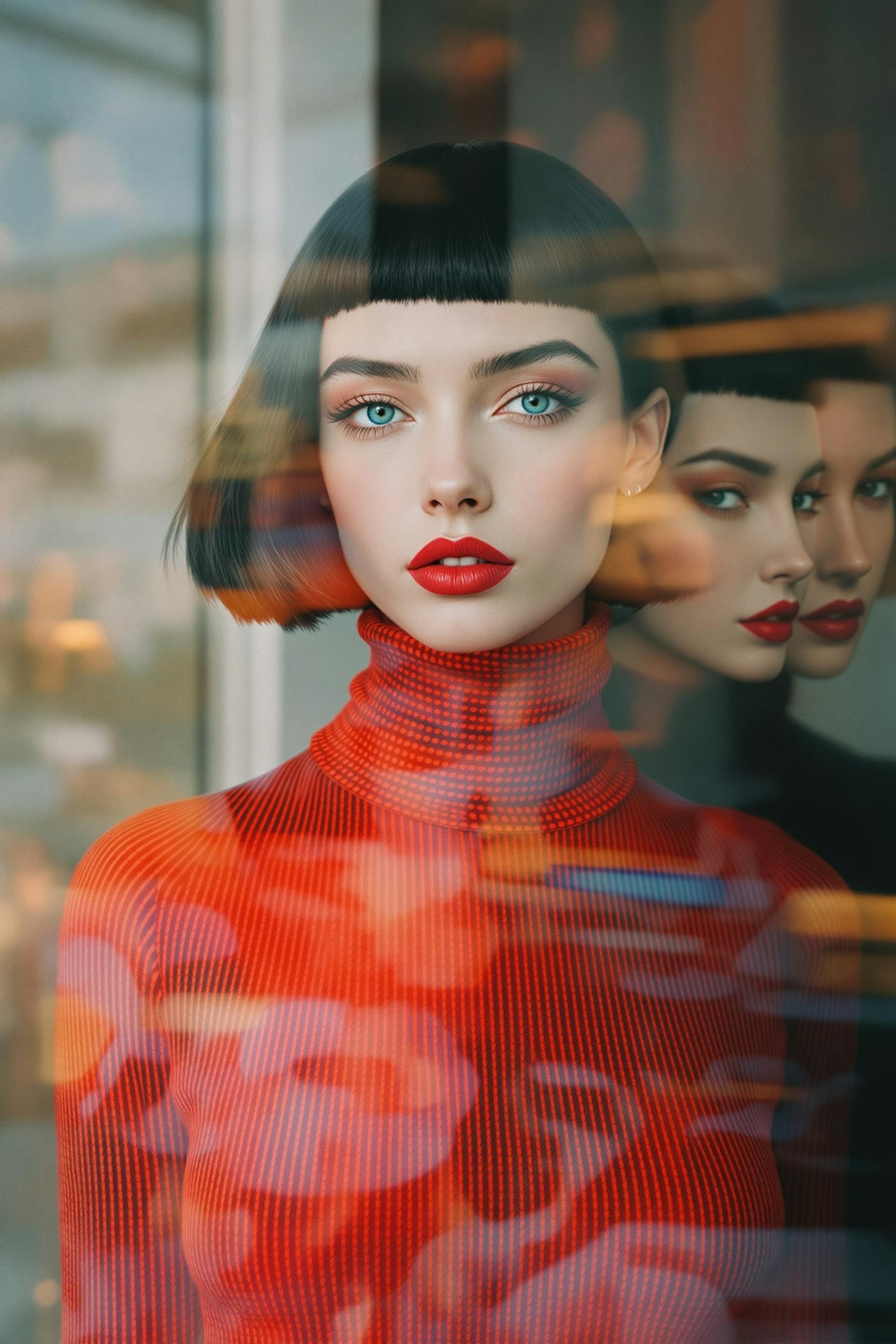 A striking portrait of a woman in a red turtleneck, with reflections and warm tones creating a modern, artistic composition.