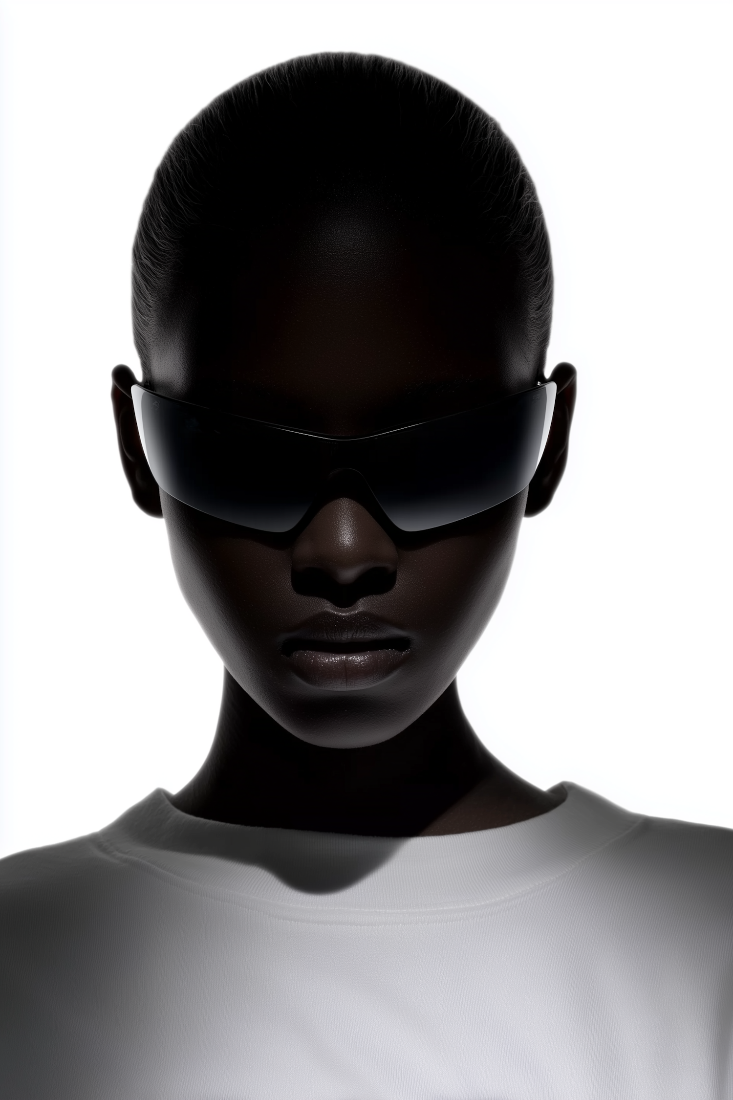 A bold portrait of a person in reflective sunglasses and a white top, with dramatic lighting emphasizing their features.