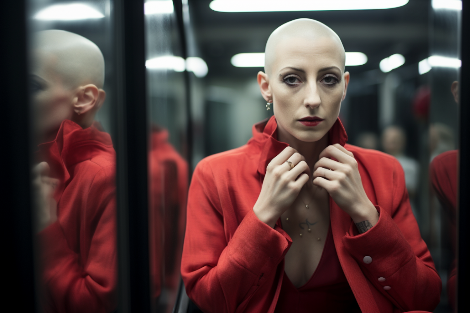 Bald woman in a striking red suit, holding her collar with confidence, reflected in glass panels. Dramatic makeup and poised expression.