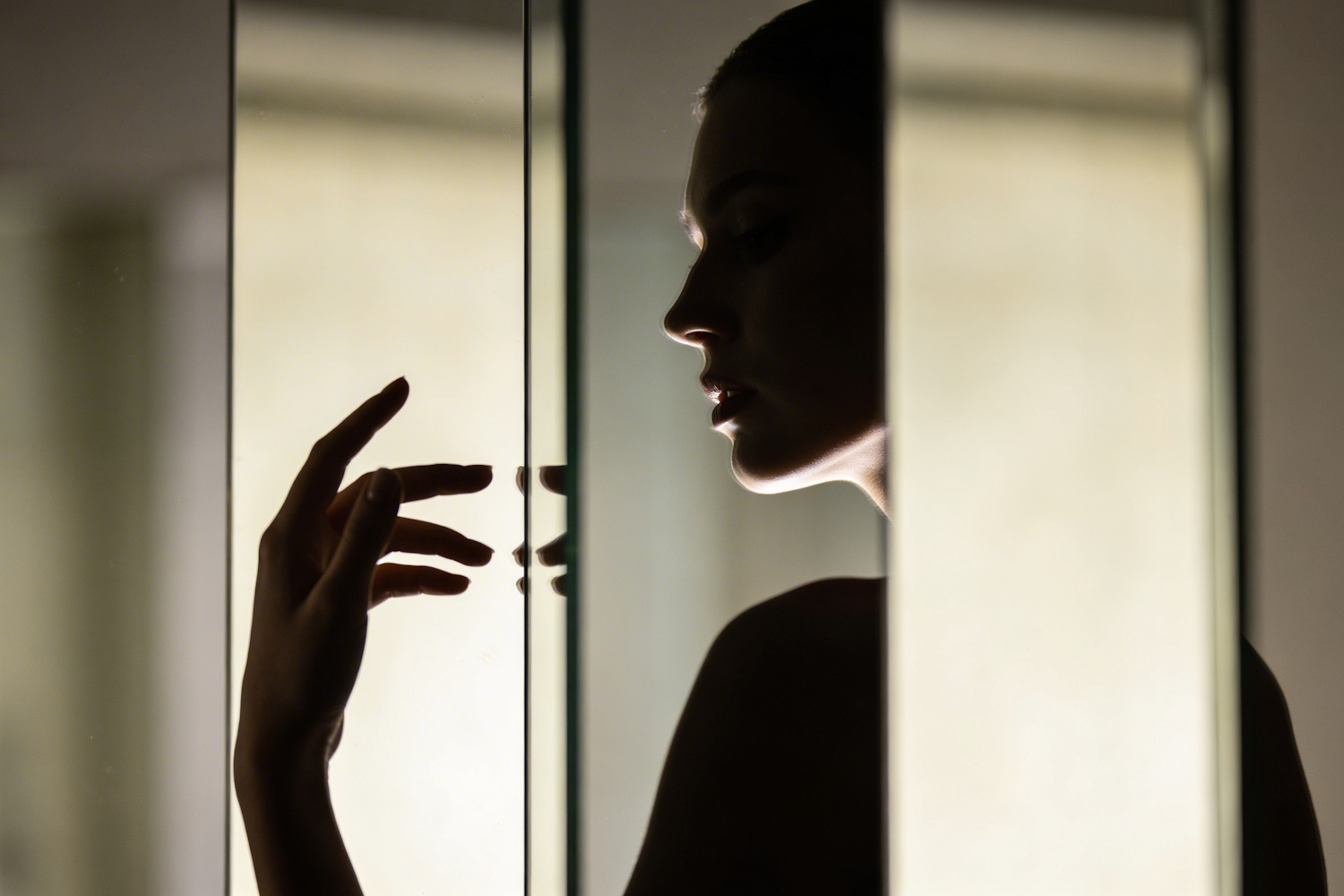 A model half-obscured by a mirrored column, fragmented into reflections and negative space, one hand suspended mid-gesture, directional spill tracing jawline while the rest dissolves into subdued, editorial silence.