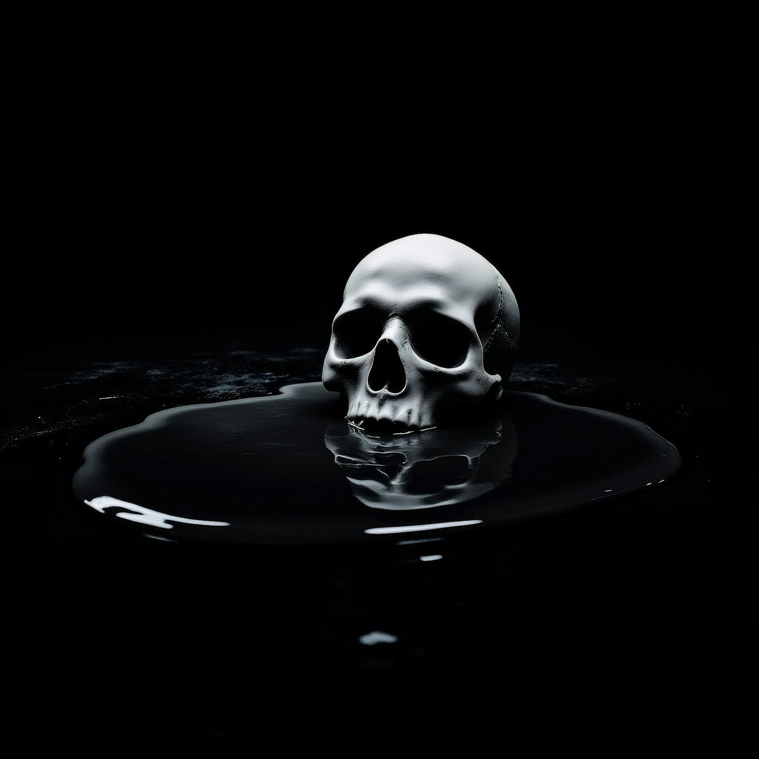 A white skull partially submerged in a reflective dark liquid, set against a black background, creating a dramatic and minimalistic scene.