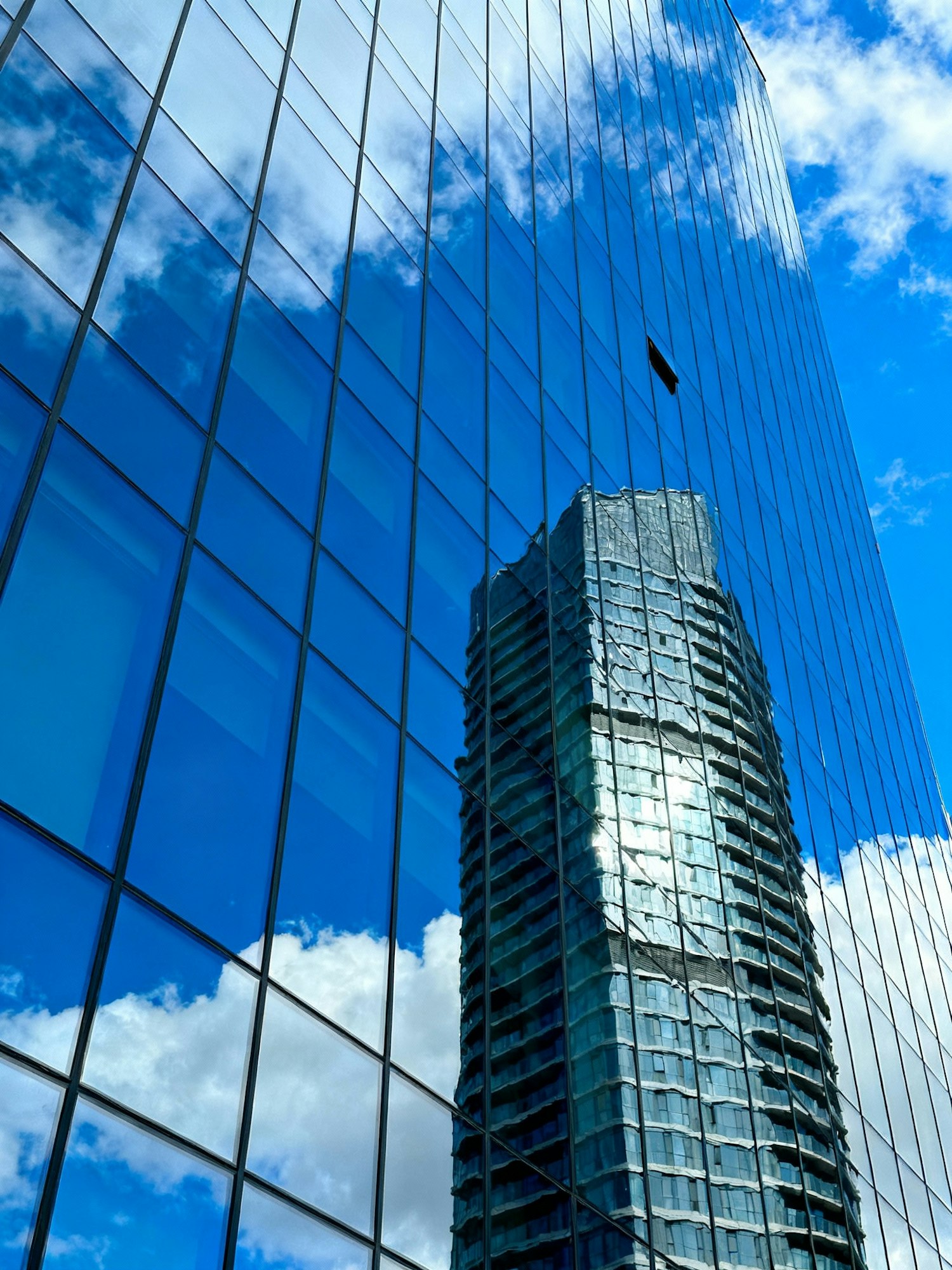 A reflective skyscraper facade mirrors another building and a vibrant blue sky with clouds, creating a dynamic architectural scene.
