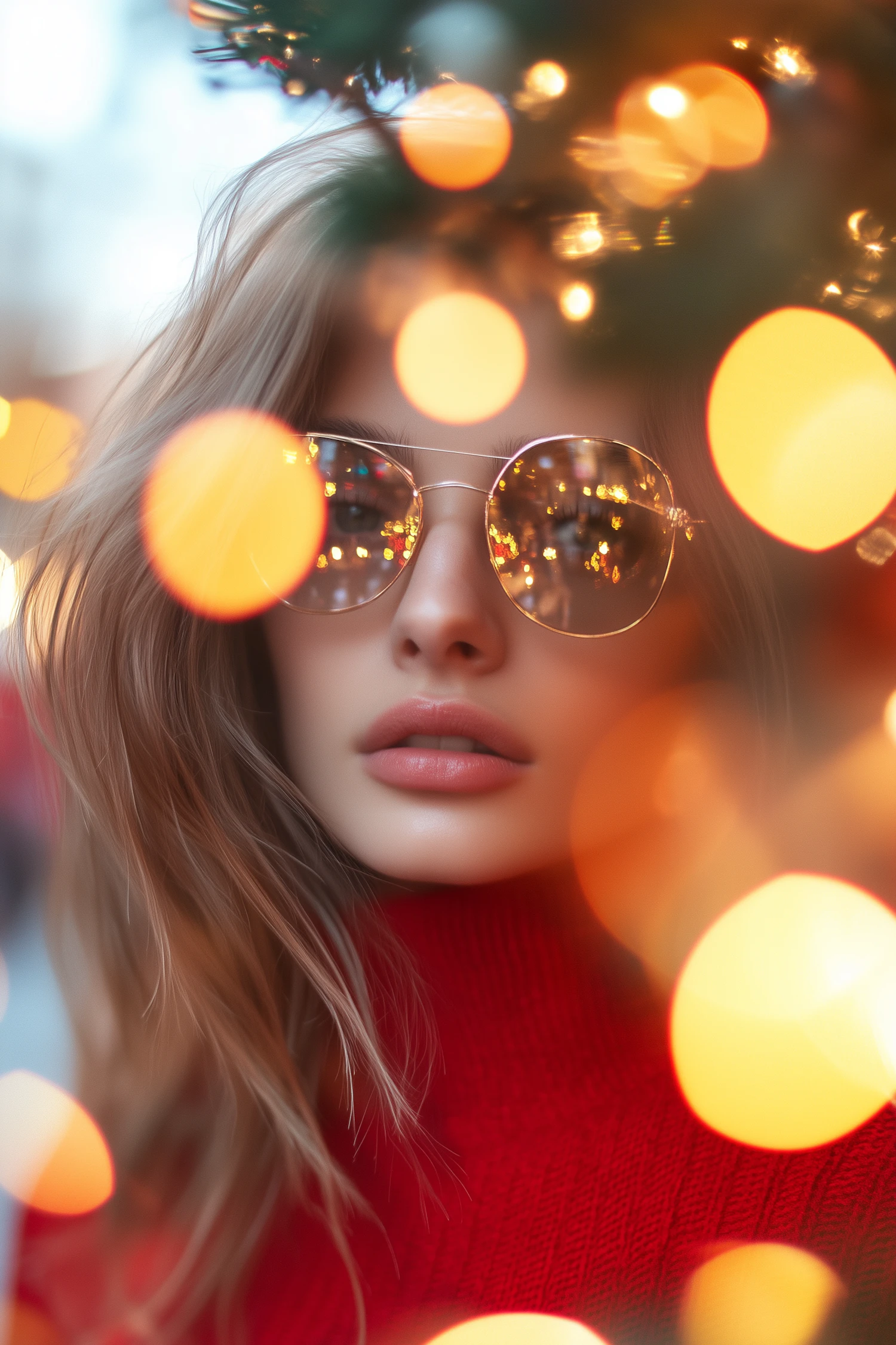 Close-up of a woman in aviator sunglasses reflecting festive lights, wearing a red sweater with warm bokeh effects in the background.