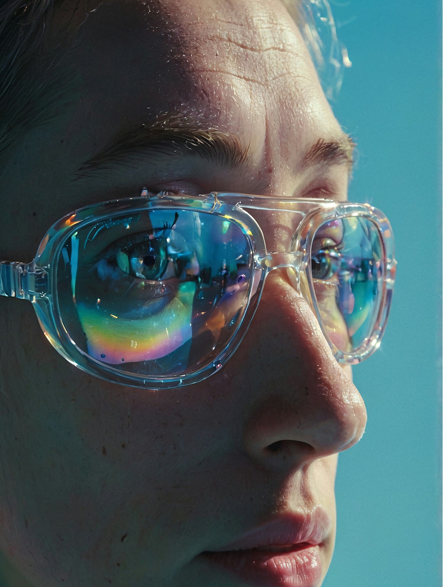 Close-up of a face wearing clear, iridescent sunglasses reflecting vibrant colors, set against a bright turquoise background.