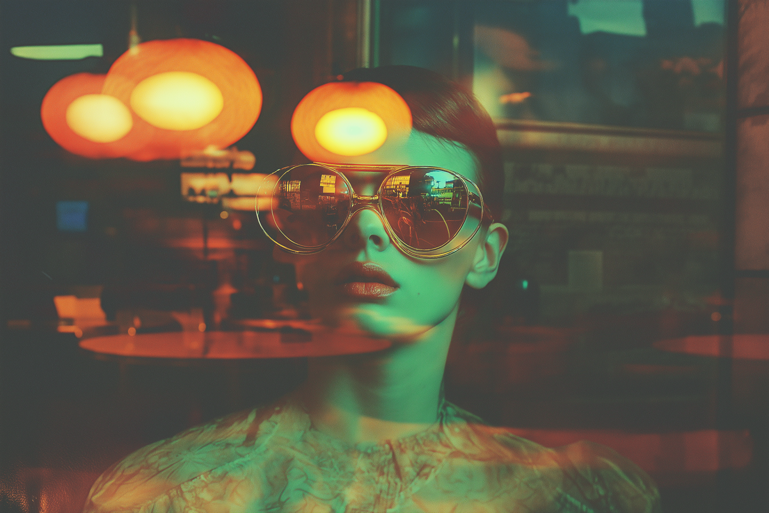 Artistic portrait with oversized sunglasses reflecting warm lights, creating a surreal, retro-futuristic vibe in a moody setting.