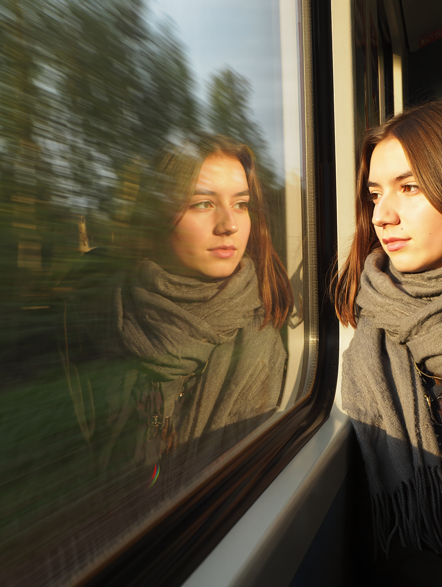 A young woman gazes out of a train window, her reflection visible, with sunlight illuminating her face and a blurred landscape outside.