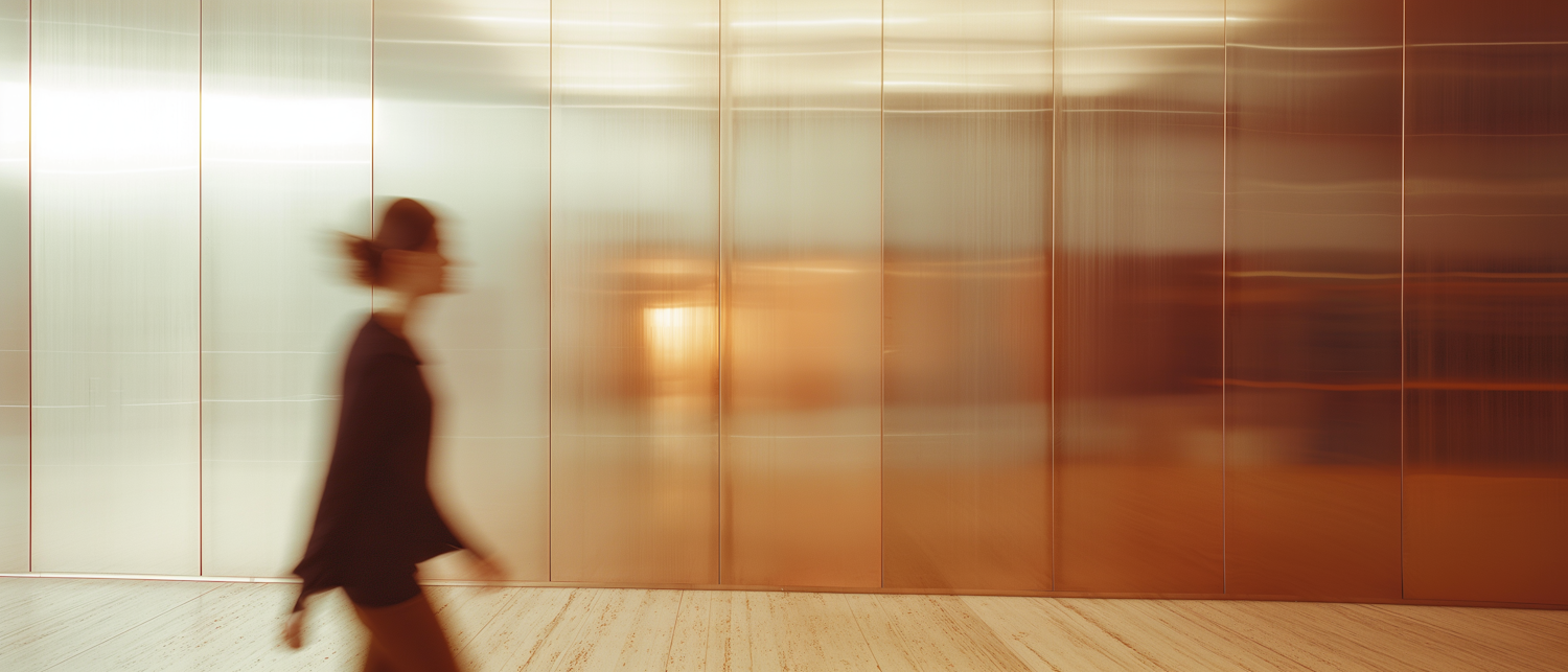Blurred figure walking past a sleek, metallic wall with warm tones, creating a dynamic and modern atmosphere.