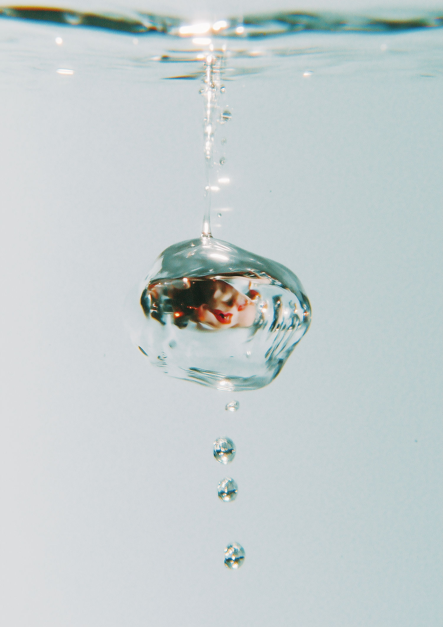 A reflective water droplet captures a distorted human face, set against a soft blue background with smaller droplets trailing below.