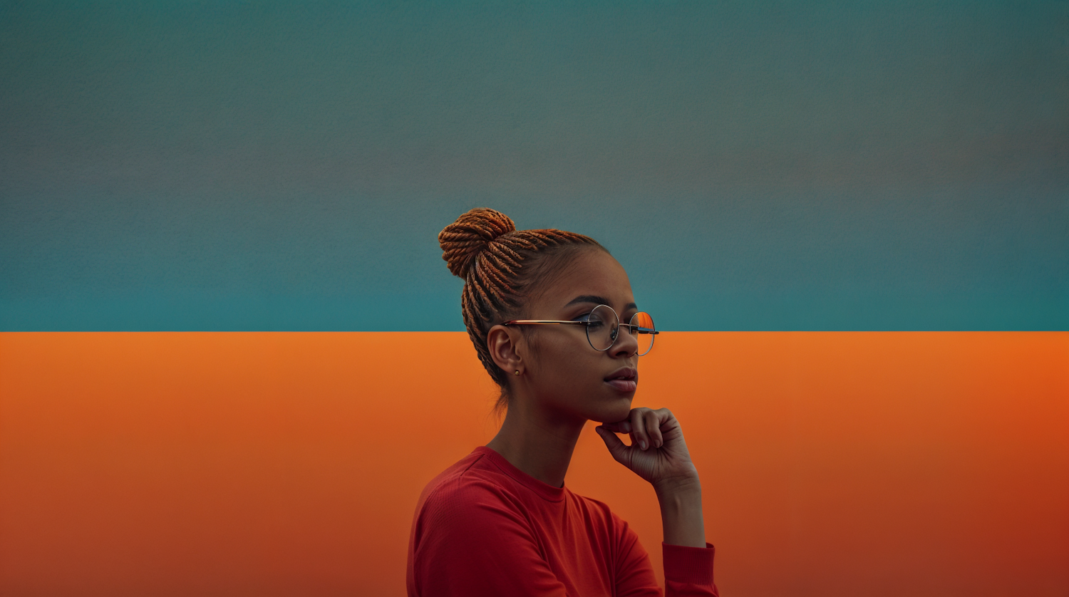 Thoughtful woman with braided bun and glasses against a teal and orange background, wearing a red shirt. Minimalist and vibrant.