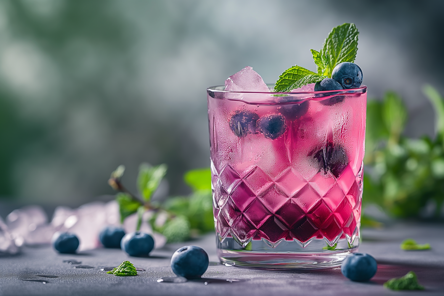 Vibrant pink cocktail with blueberries and mint in a textured glass, set against a blurred green background for a refreshing look.