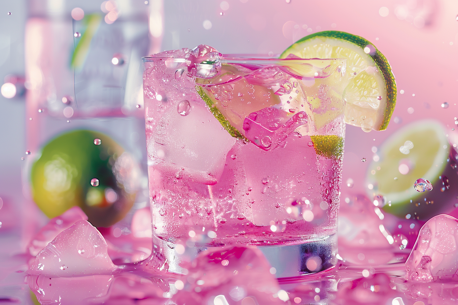 Refreshing pink fizzy drink with lime slices and ice cubes, set against a soft pink background, creating a vibrant and lively scene.