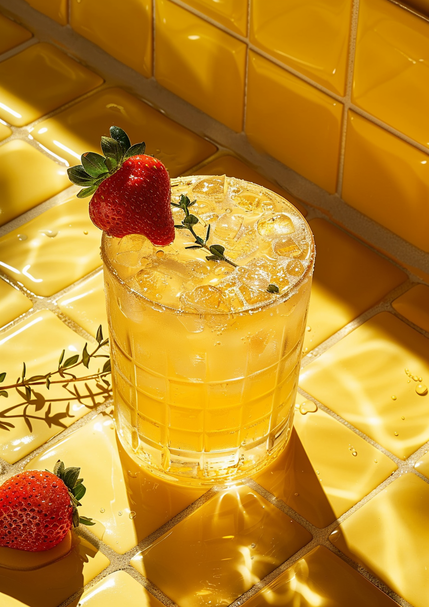 Refreshing iced tea with strawberry and thyme on sunny yellow tiles, capturing a vibrant and summery vibe.