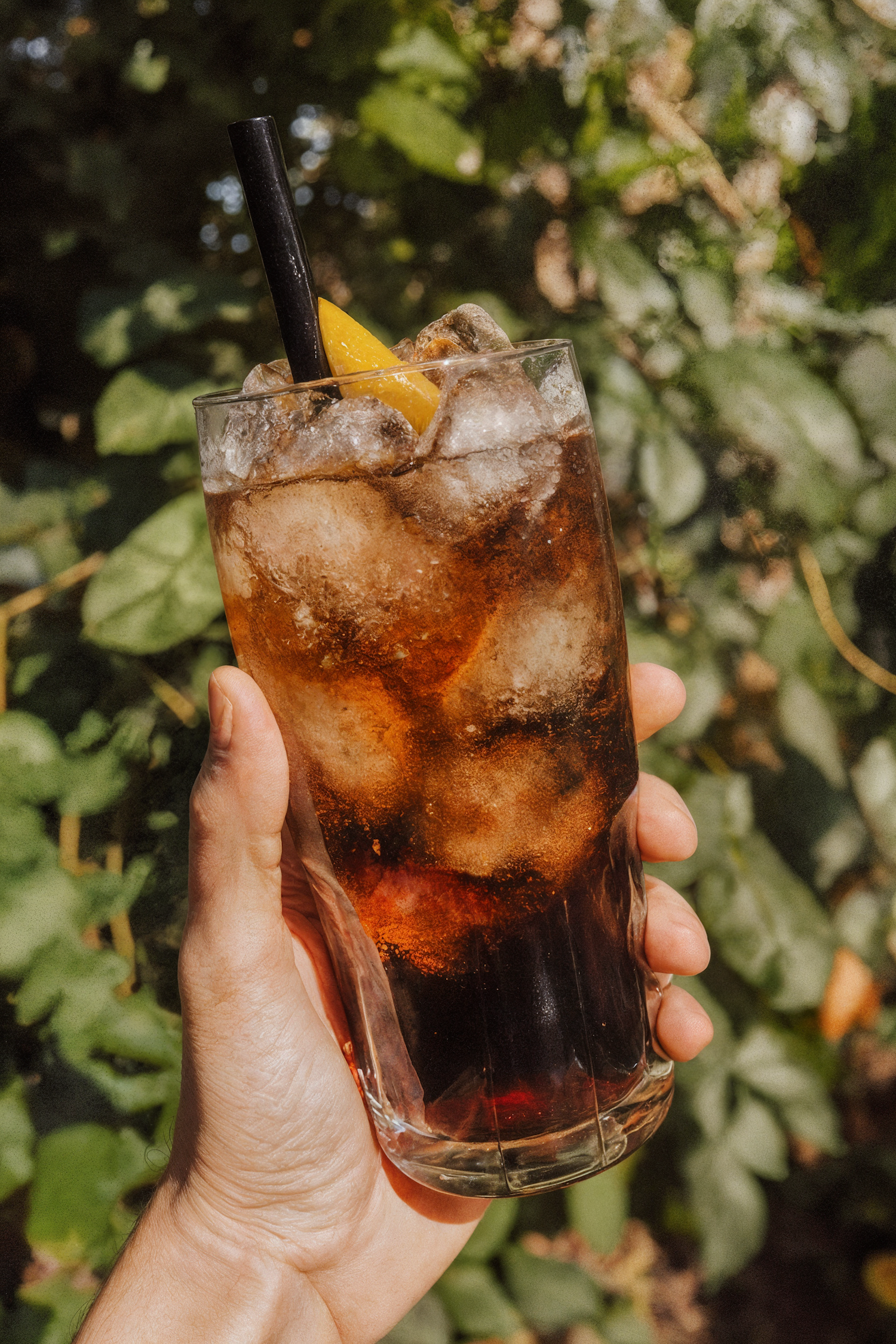 A refreshing glass of iced cola with lemon and a straw, held outdoors against a sunny, leafy background.