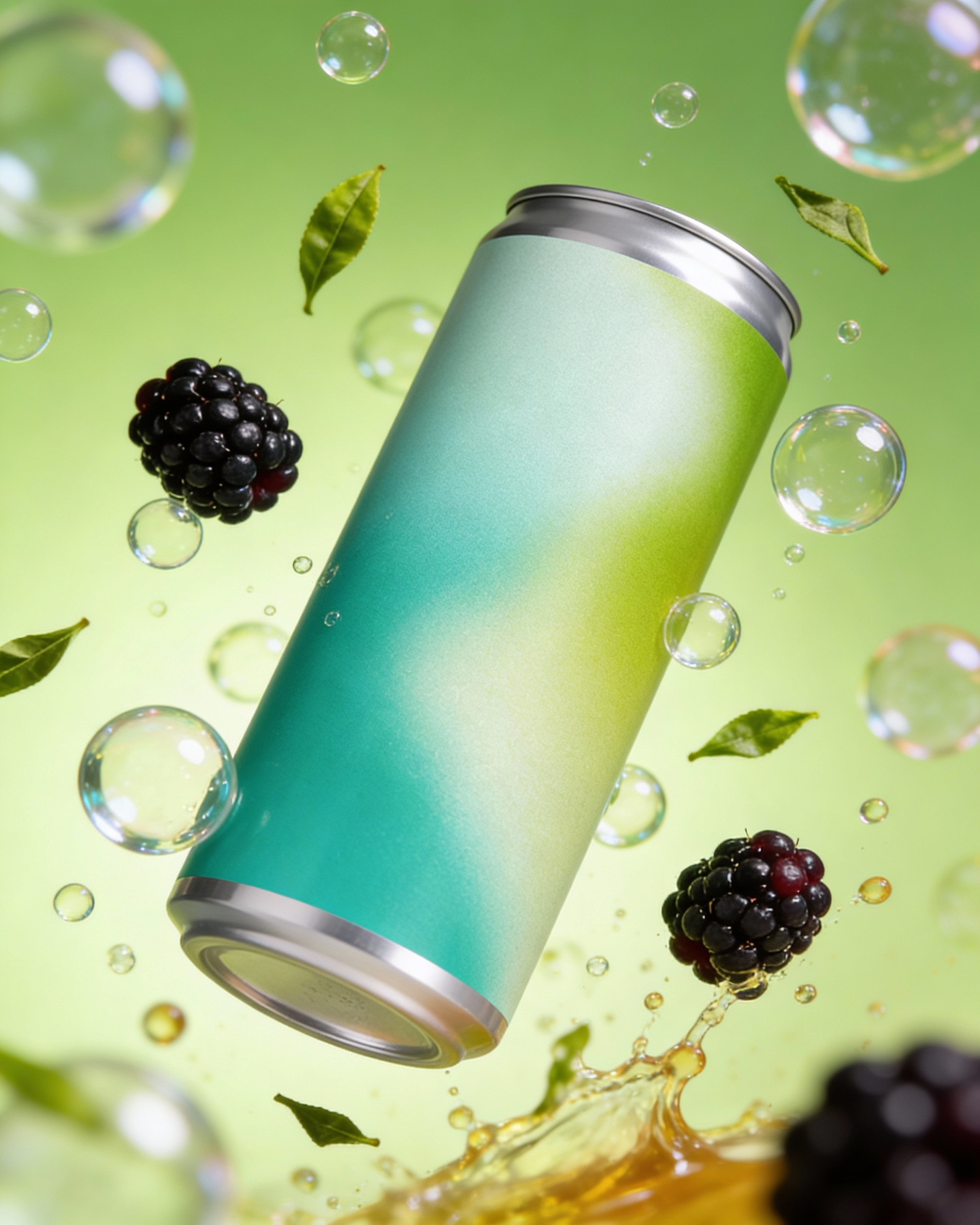 A sleek beverage can with a green-blue gradient surrounded by blackberries, leaves, and bubbles on a vibrant green background.