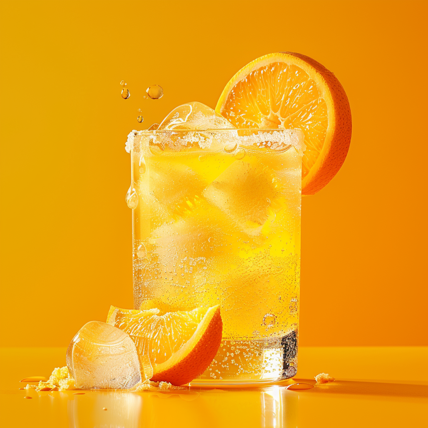 Refreshing orange soda with ice cubes and fresh orange slice against a vibrant orange background, evoking a summery vibe.