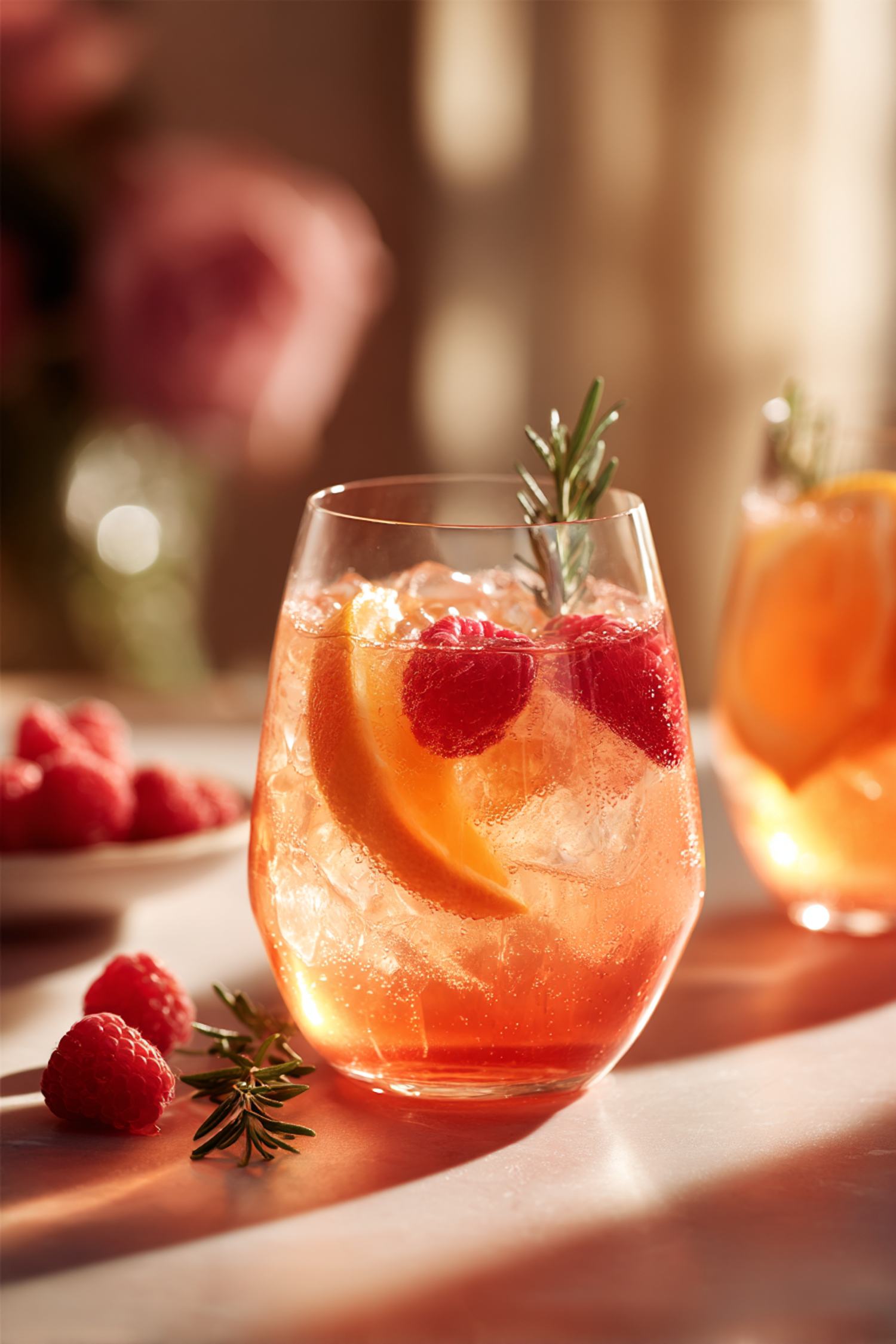 Refreshing cocktail with orange slices, raspberries, and rosemary in a clear glass, perfect for a sunny day. Vibrant and inviting!