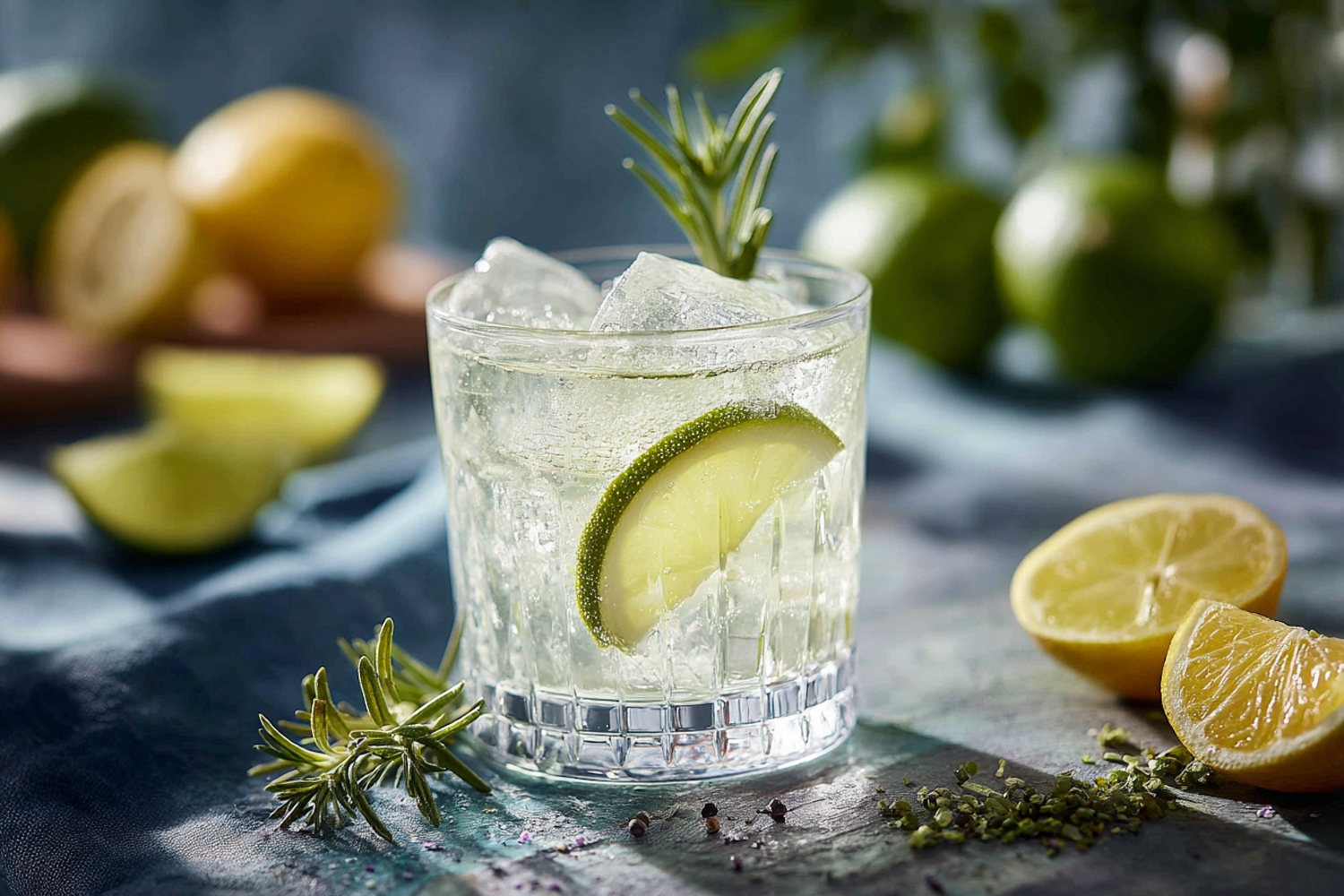 A refreshing cocktail with lime, rosemary, and ice, surrounded by fresh citrus and herbs on a textured blue surface.