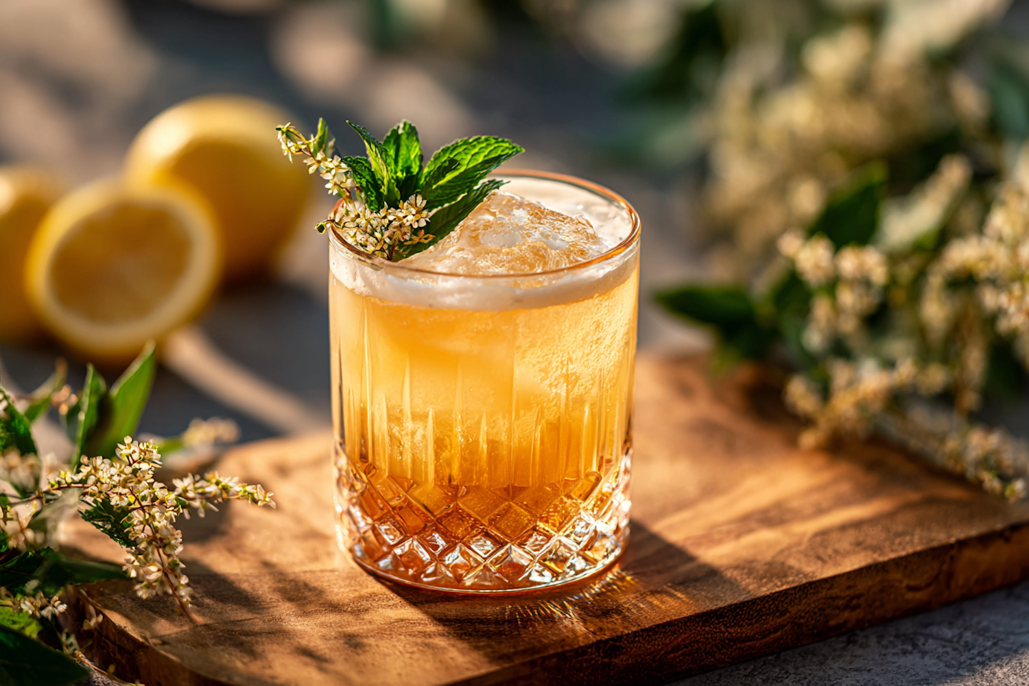 A golden cocktail with mint and floral garnish in a crystal glass, set on a wooden board with lemons and greenery in the background.