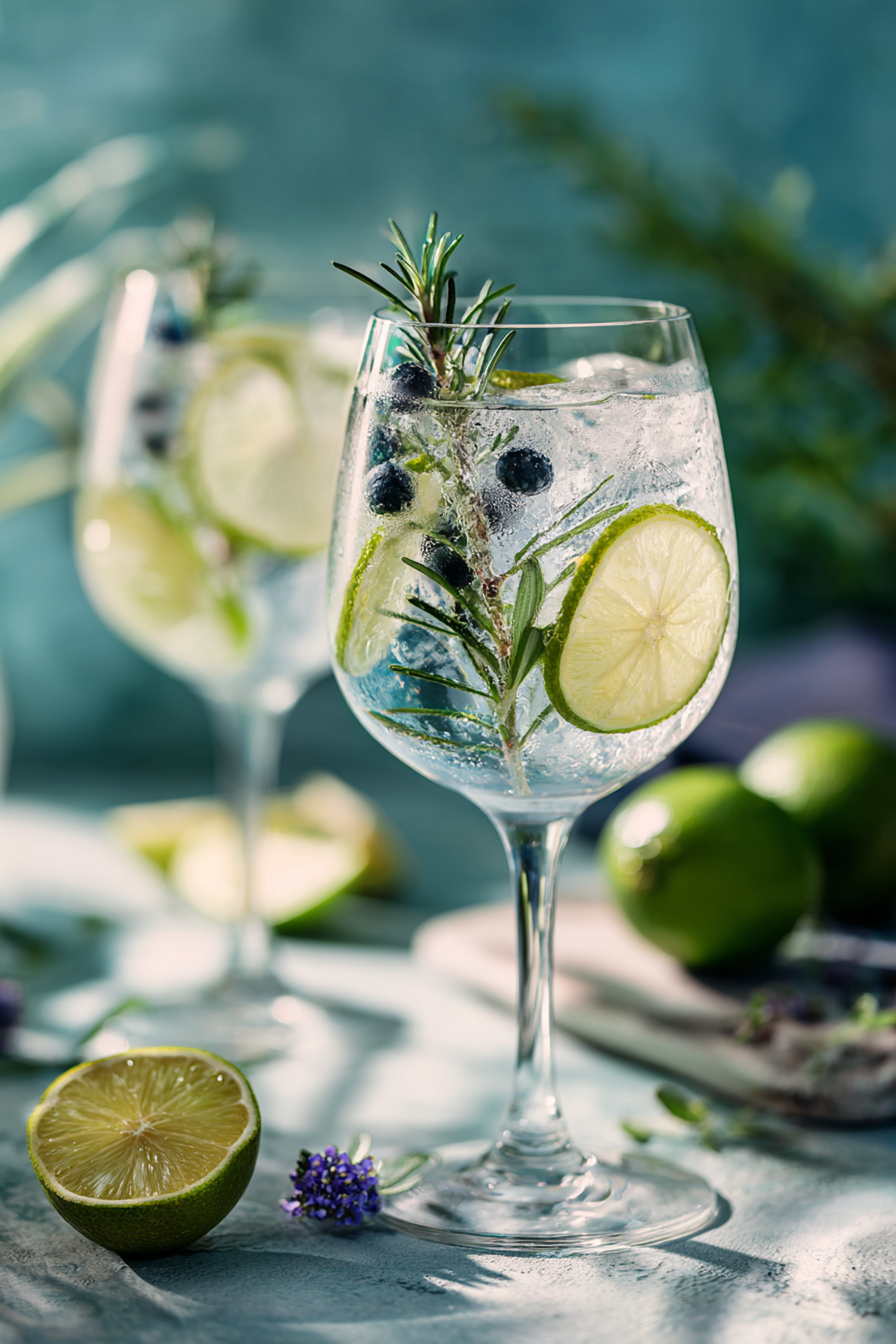 Refreshing cocktail with lime, blueberries, and rosemary in elegant glasses, perfect for a summer vibe or a stylish drink setup.