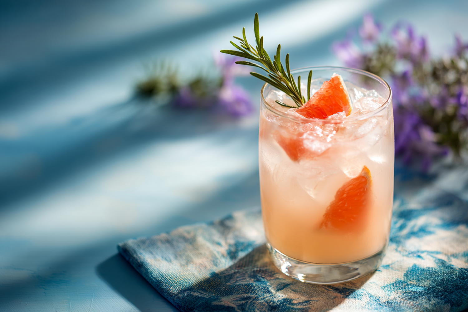 Refreshing grapefruit cocktail with rosemary garnish on a sunny blue background, perfect for summer vibes and relaxation.