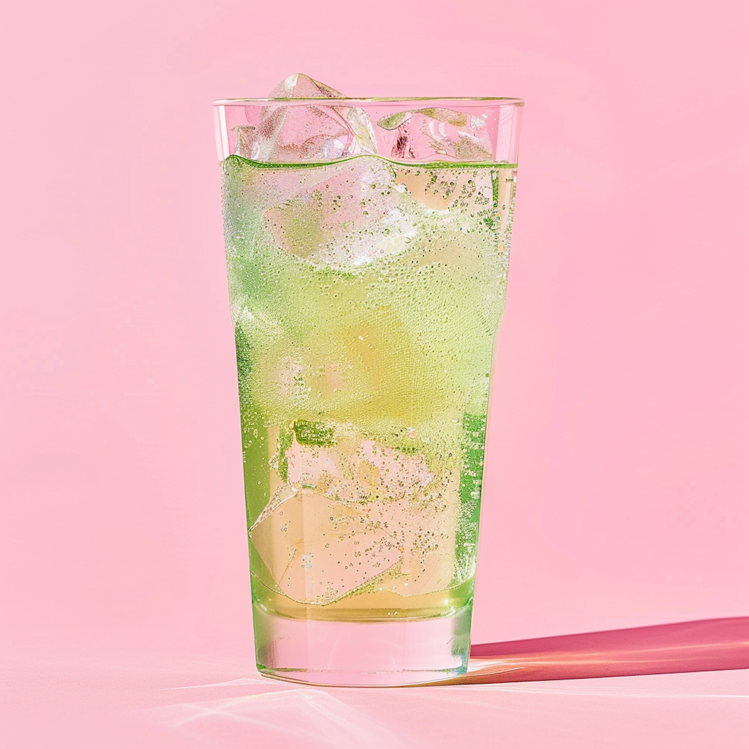 Refreshing green fizzy drink in a tall glass with ice cubes against a soft pink background.