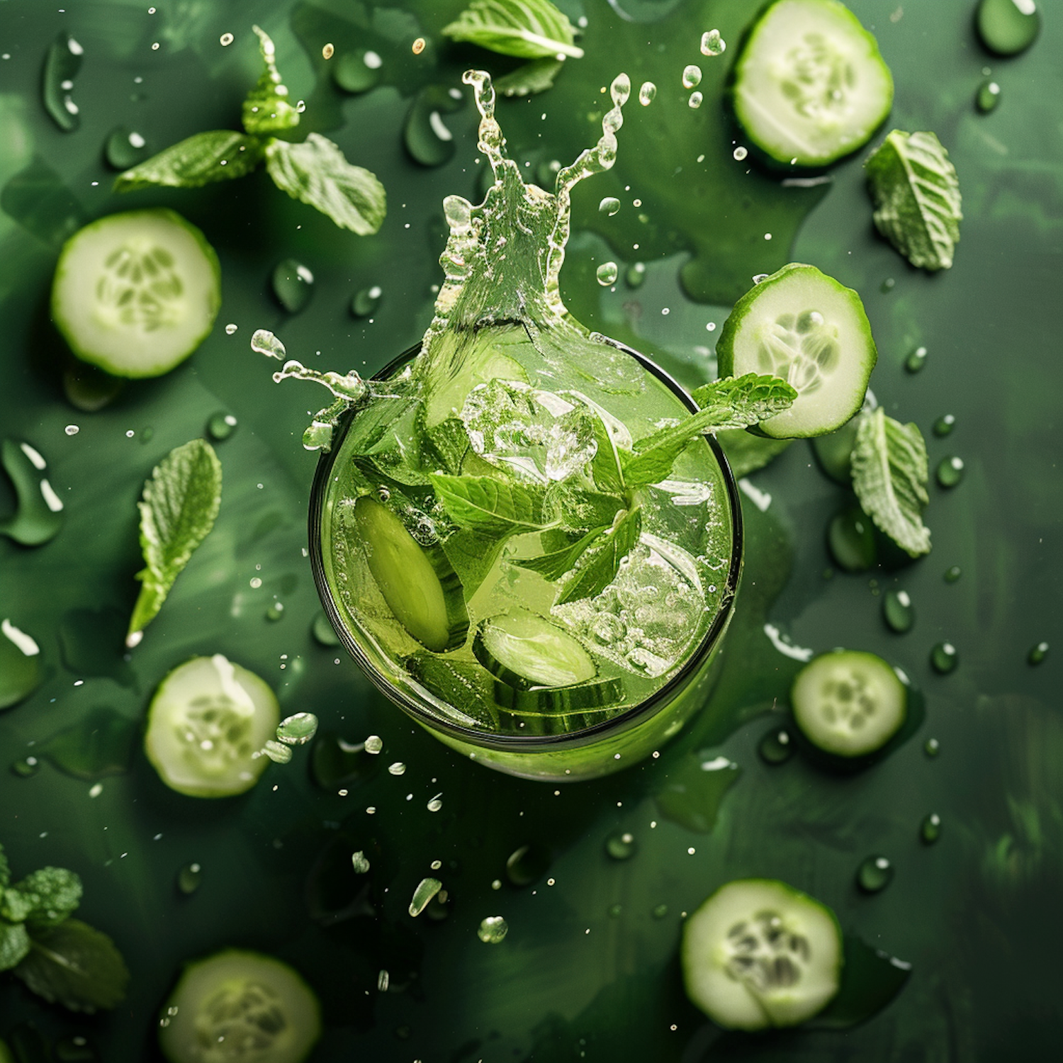 Refreshing green drink with mint and cucumber, captured mid-splash, surrounded by fresh garnishes on a vibrant green background.