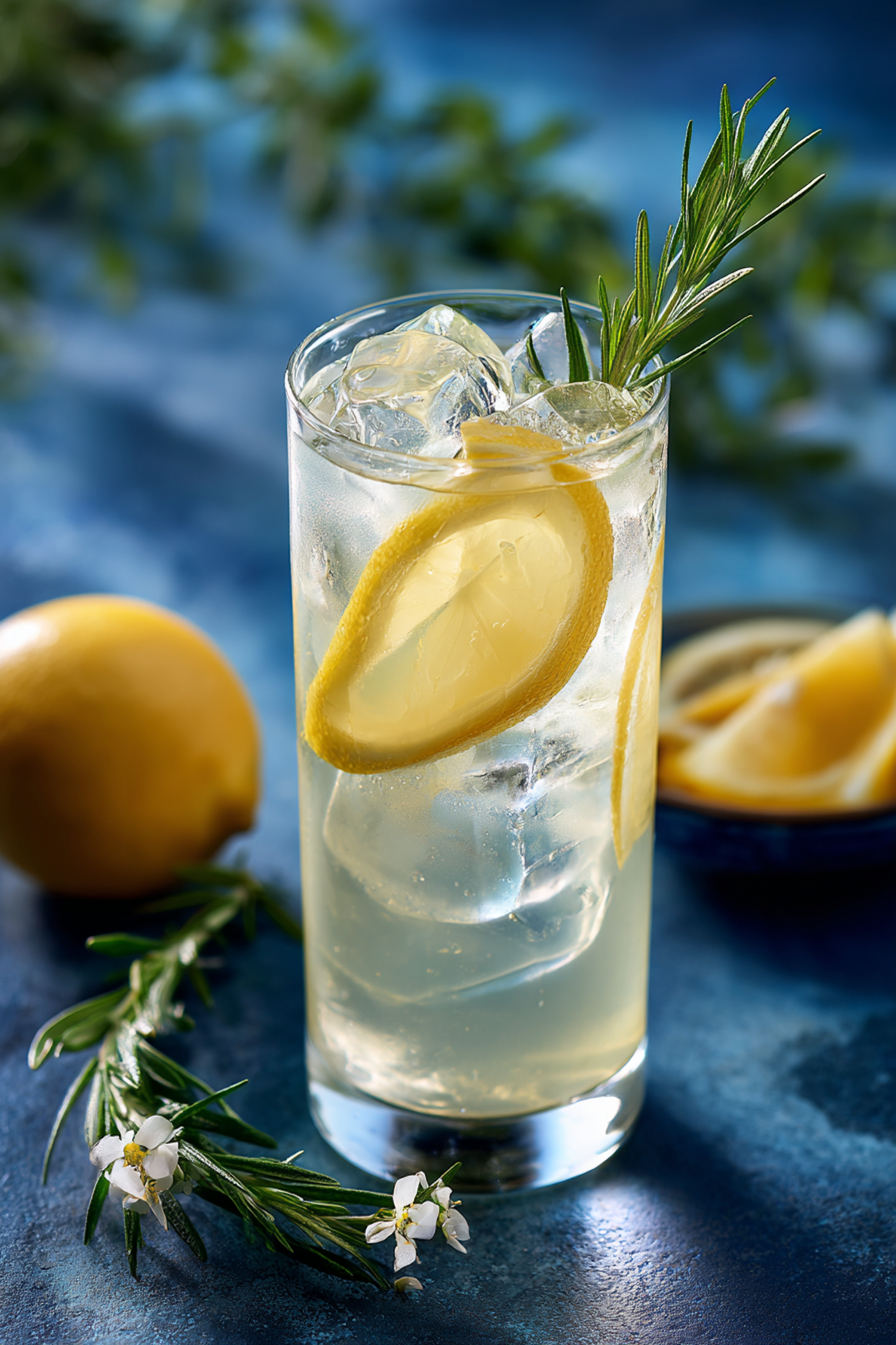 A tall glass of iced lemonade garnished with lemon slices and rosemary, set on a blue surface with fresh lemons and greenery around.