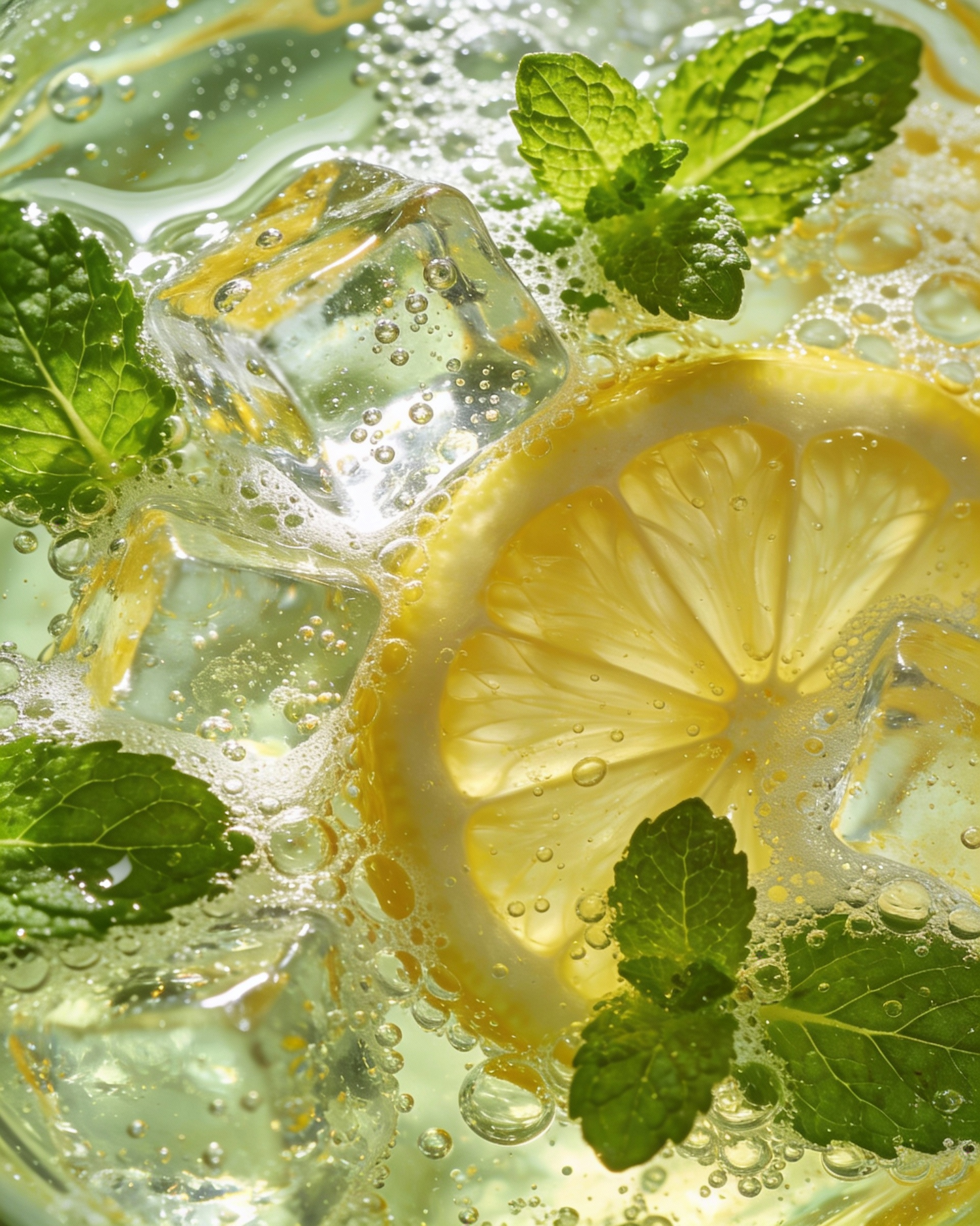 A vibrant close-up of a lemon slice, ice cubes, and mint leaves in a bubbly drink, showcasing freshness and refreshment.