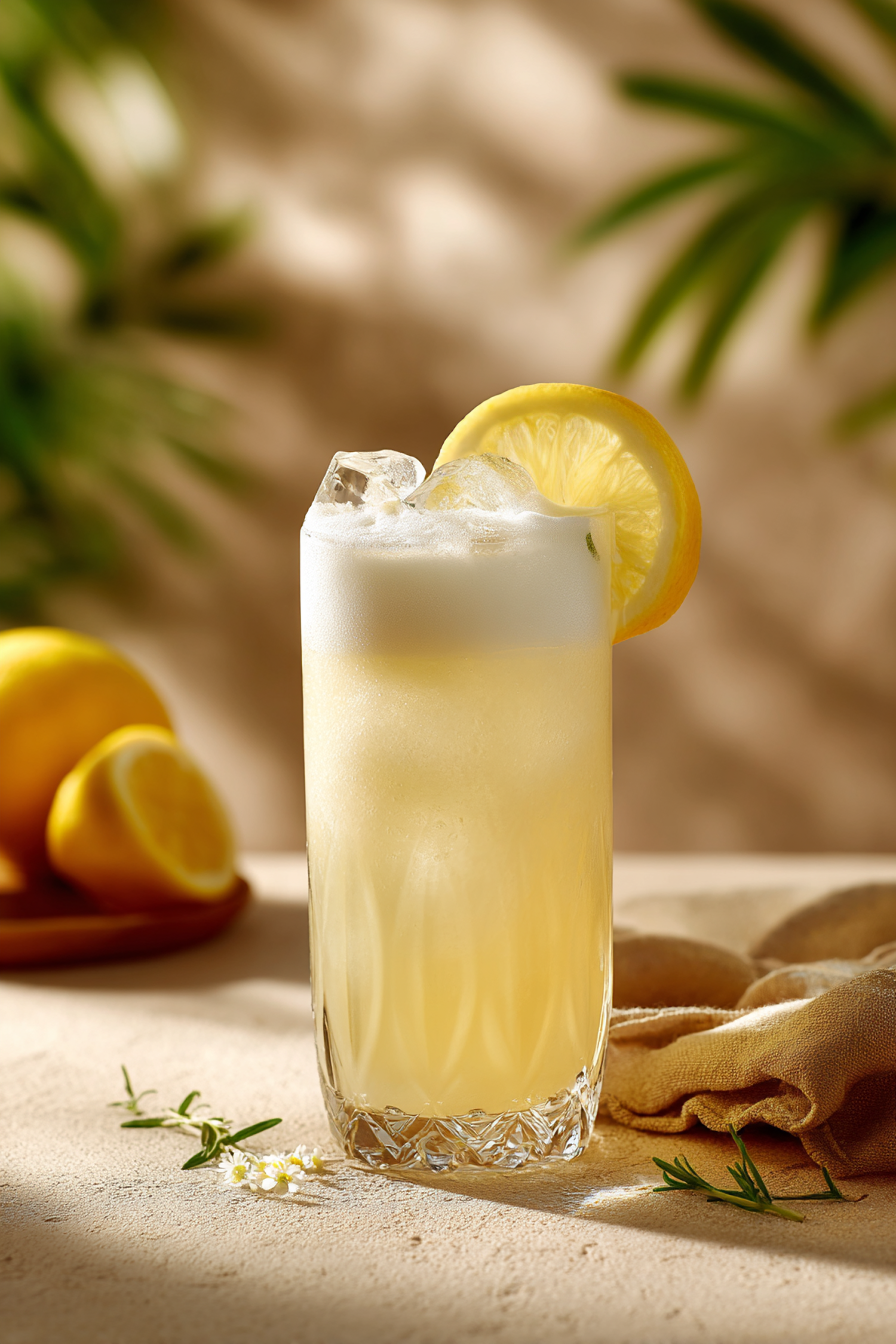 A tall glass of frothy lemonade garnished with a lemon slice, set against a sunny backdrop with fresh lemons and herbs.